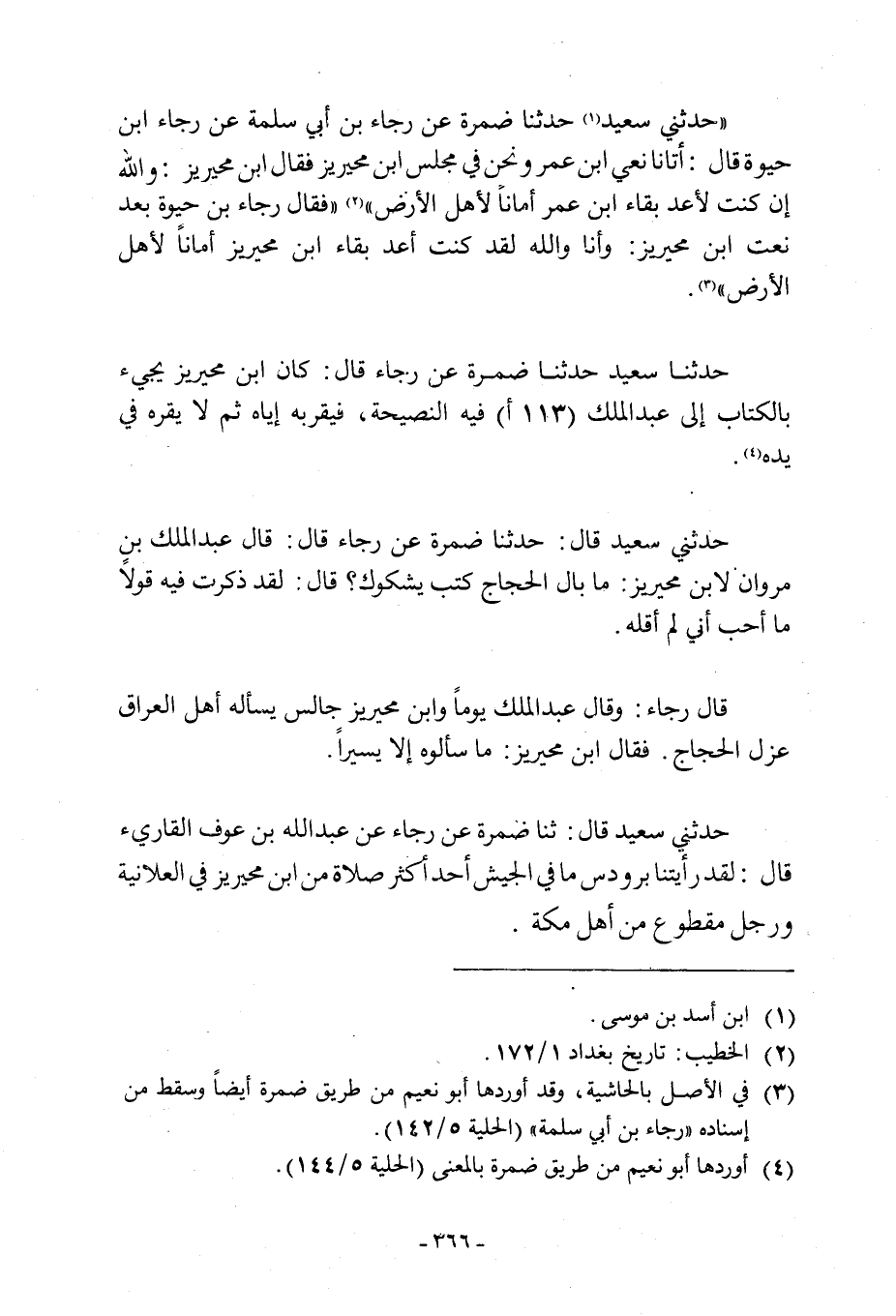 «حَدَّثَنِي سَعِيدٌ [1] حَدَّثَنَا ضَمْرَةُ عَنْ رَجَاءِ بْنِ أبي سلمة عن رجاء ابن حَيْوَةَ: أَتَانَا نَعْيُ ابْنِ عُمَرَ وَنَحْنُ فِي مجلس ابن محيريز فقال ابن محيريز: وَاللَّهِ إِنْ كُنْتُ لَأَعُدُّ بَقَاءَ ابْنِ عُمَرَ أَمَانًا لِأَهْلِ الْأَرْضِ» [2] «فَقَالَ رَجَاءُ بْنُ حَيْوَةَ بَعْدَ نَعْتِ ابْنِ مُحَيْرِيزٍ: وَأَنَا وَاللَّهِ لَقَدْ كُنْتُ أَعُدُّ بَقَاءَ ابْنِ مُحَيْرِيزَ أَمَانًا لِأَهْلِ الْأَرْضِ» [3] .