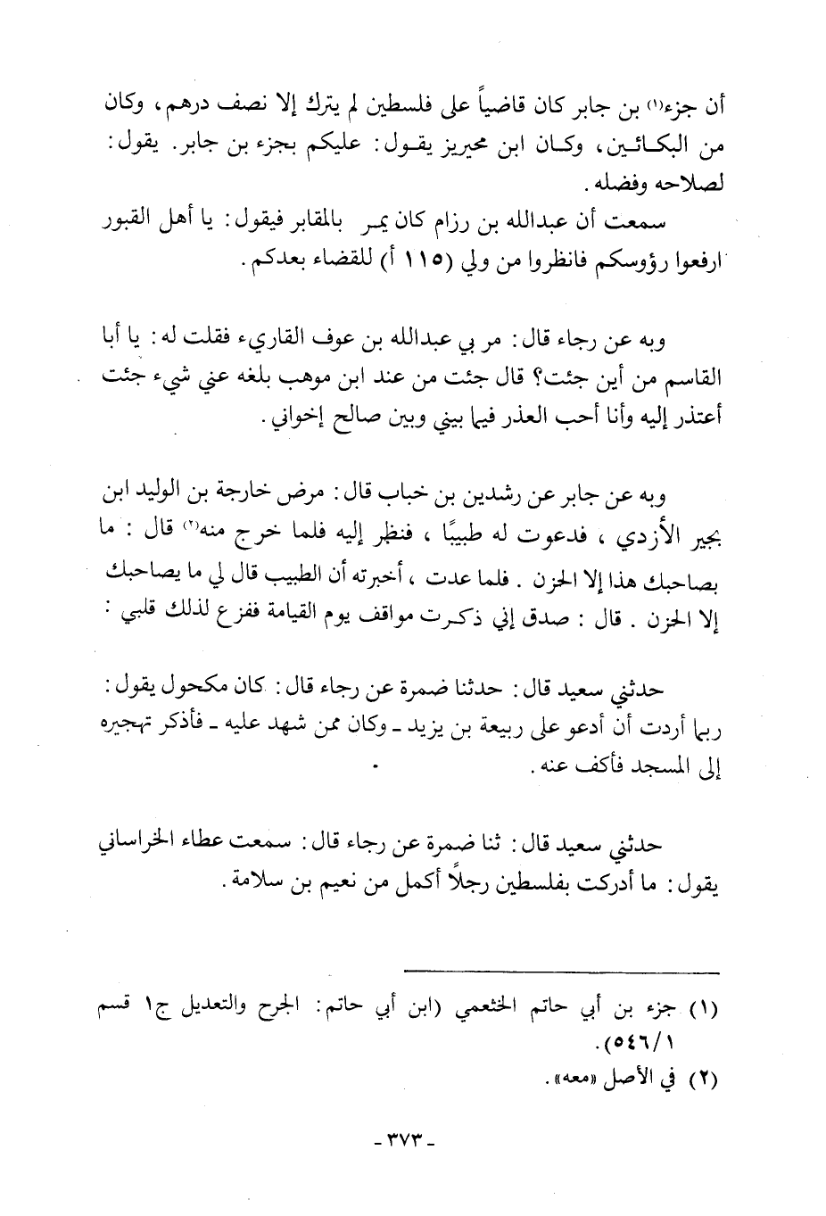 بَلَغَنِي أَنَّ جَزْءَ [1] بْنَ جَابِرٍ كَانَ قَاضِيًا على فلسطين لم يترك إلا نصف درهم، وكان من البكاءين، وَكَانَ ابْنُ مُحَيْرِيزٍ يَقُولُ: عَلَيْكُمْ بِجَزْءِ بْنِ جَابِرٍ. يَقُولُ: لِصَلَاحِهِ وَفَضْلِهِ.