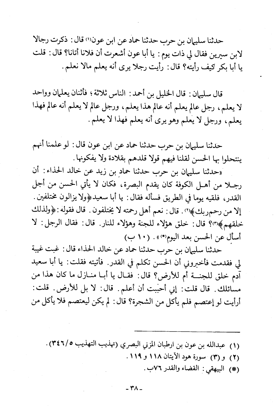 قَالَ سُلَيْمَانُ: قَالَ الْخَلِيلُ بْنُ أَحْمَدَ: النَّاسُ ثَلَاثَةٌ، فَاثْنَانِ يَعْلَمَانِ وَوَاحِدٌ لَا يَعْلَمُ، رَجُلٌ عَالِمٌ يَعْلَمُ أَنَّهُ عَالِمٌ هَذَا يَعْلَمُ، وَرَجُلٌ عَالِمٌ لَا يَعْلَمُ أَنَّهُ عَالِمٌ فهَذَا يَعْلَمُ، وَرَجُلٌ لَا يَعْلَمُ وَهُوَ يَرَى أَنَّهُ يَعْلَمُ فَهَذَا لَا يَعْلَمُ حَدَّثَنَا سُلَيْمَانُ بْنُ حرب حدثنا حماد عن ابن عون قال: لو علمنا أنهم ينتحلوا بِهَا الْحَسَنَ لَقُلْنَا فِيهِمْ قَوْلًا قَلَّدَهُمْ بِقِلَادَةٍ وَلَا يَفُكُّونَهَا.