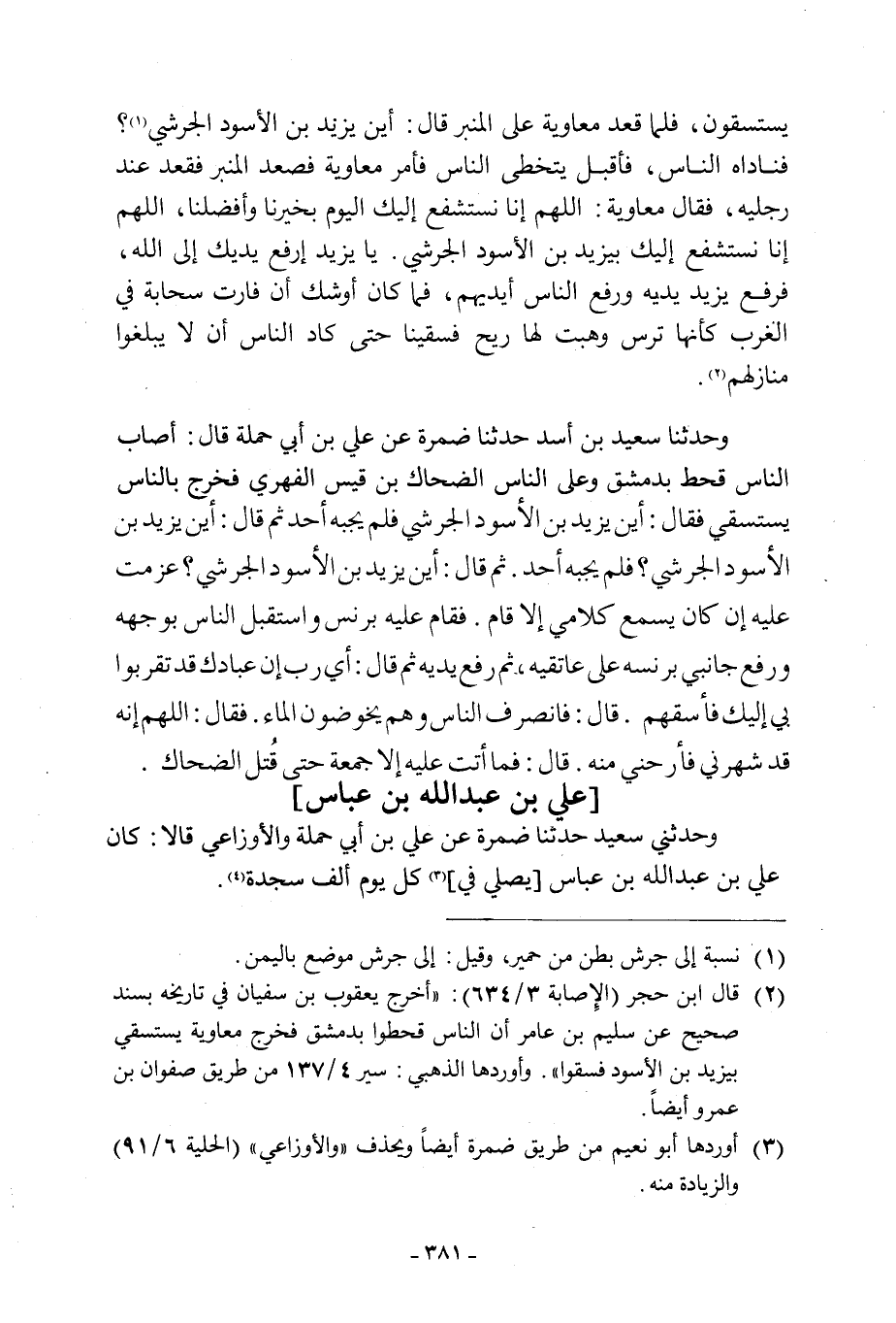 [2] قال ابن حجر (الاصابة 3/ 634) : «اخرج يعقوب بن سفيان في تاريخه بسند صحيح عن سليم بن عامر ان الناس قحطوا بدمشق فخرج معاوية يستسقي بيزيد بن الأسود فسقوا» .