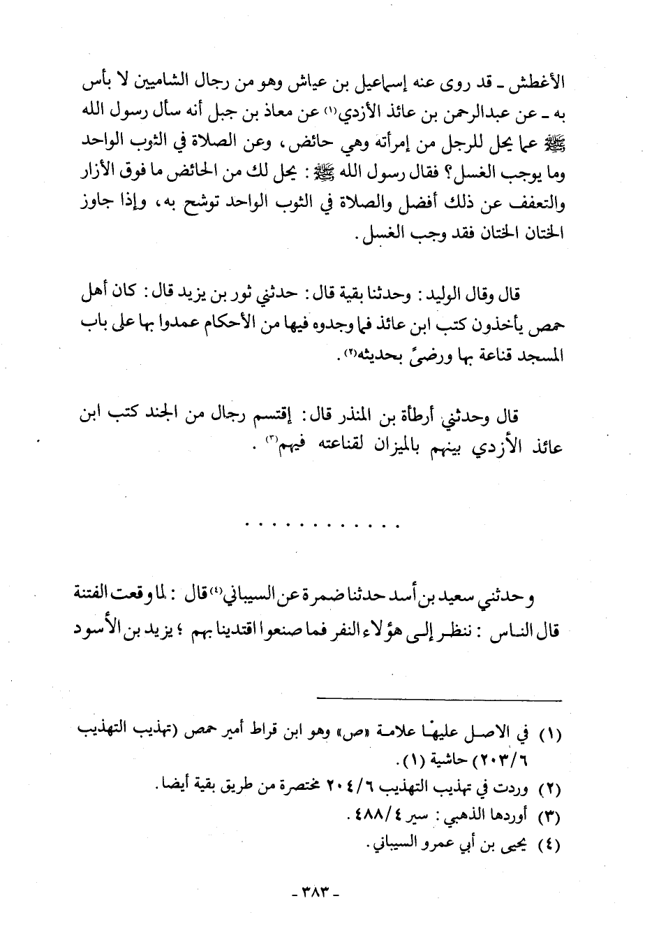 الْأَغْطَشُ- قَدْ رَوَى عَنْهُ إِسْمَاعِيلُ بْنُ عَيَّاشٍ وَهُوَ مِنْ رِجَالِ الشَّامِيِّينَ لَا بَأْسَ بِهِ- عَنْ عَبْدِ الرَّحْمَنِ بْنِ عَائِذٍ الْأَزْدِيِّ [1] عَنْ مُعَاذِ بْنِ جَبَلٍ أَنَّهُ سَأَلَ رَسُولَ اللَّهِ صَلَّى اللَّهُ عَلَيْهِ وَسَلَّمَ عَمَّا يَحِلُّ لِلرَّجُلِ من امرأته وهو حَائِضٌ، وَعَنِ الصَّلَاةِ فِي الثَّوْبِ الْوَاحِدِ وَمَا يُوجِبُ الْغُسْلَ؟ فَقَالَ رَسُولُ اللَّهِ صَلَّى اللَّهُ عَلَيْهِ وَسَلَّمَ: يَحِلُّ لَكَ مِنَ الْحَائِضِ مَا فَوْقَ الْإِزَارِ وَالتَّعَفُّفُ عَنْ ذَلِكَ أَفْضَلُ وَالصَّلَاةُ فِي الثَّوْبِ الْوَاحِدِ تَوَشَّحْ بِهِ، وَإِذَا جَاوَزَ الْخِتَانُ الْخِتَانَ فَقَدْ وَجَبَ الْغُسْلُ. قَالَ وَقَالَ الْوَلِيدُ: وَحَدَّثَنَا بَقِيَّةُ قَالَ: حَدَّثَنِي ثَوْرُ بْنُ يَزِيدَ قَالَ: كَانَ أَهْلُ حِمْصَ يَأْخُذُونَ كُتُبَ ابْنِ عَائِذٍ فَمَا وَجَدُوهُ فِيهَا مِنَ الْأَحْكَامِ عَمَدُوا بِهَا عَلَى بَابِ الْمَسْجِدِ قَنَاعَةً بِهَا وَرِضًى بِحَدِيثِهِ [2] .