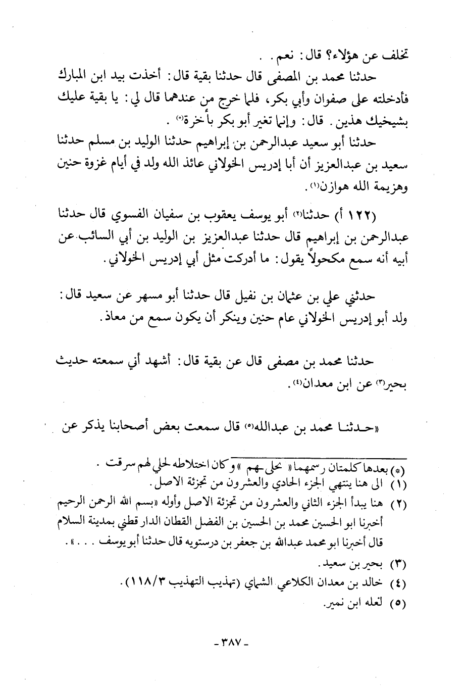 حَدَّثَنَا مُحَمَّدُ بْنُ مُصَفًّى قَالَ عَنْ بَقِيَّةَ قَالَ: أَشْهَدُ أَنِّي سَمِعْتُهُ حَدِيثَ بَحِيرٍ [3] عَنِ ابْنِ مَعْدَانَ [4] .