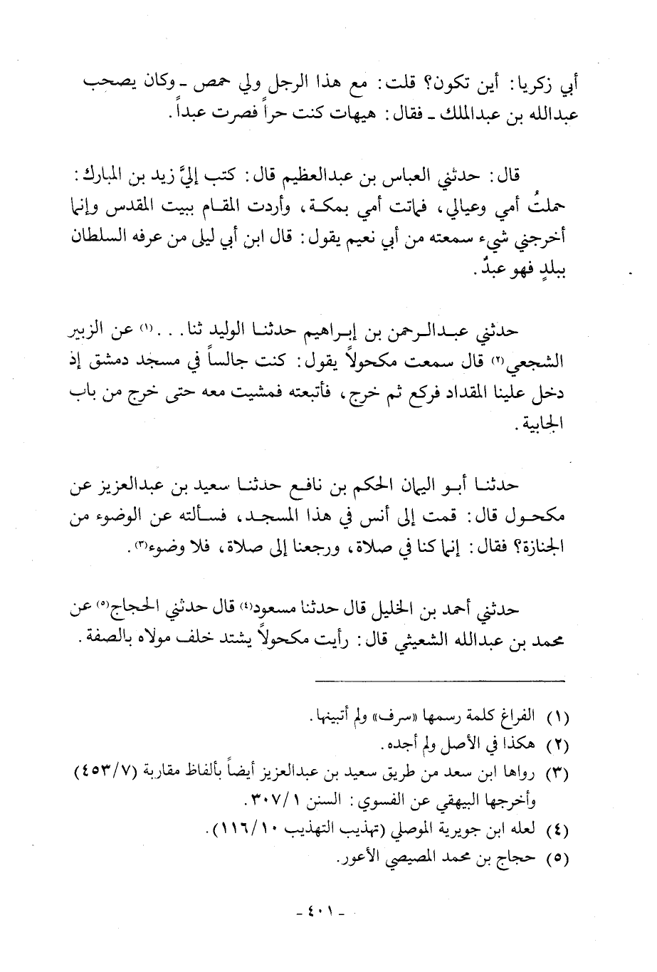 حَدَّثَنَي أَحْمَدُ بْنُ الْخَلِيلِ قَالَ حَدَّثَنَا مَسْعُودٌ [4] قَالَ حَدَّثَنِي الْحَجَّاجُ [5] عَنْ مُحَمَّدِ بْنِ عَبْدِ اللَّهِ الشّعيِثيِّ قَالَ: رَأَيْتُ مَكْحُولًا يَشْتَدُّ خلف مولاه بالصفة.