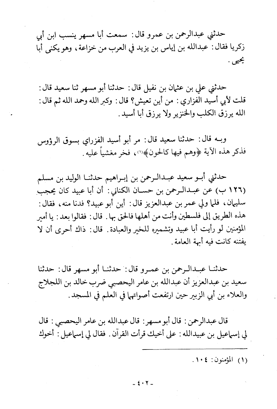 وَبِهِ قَالَ: حَدَّثَنَا سَعِيدٌ قَالَ: مَرَّ أَبُو أُسَيْدٍ الْفَزَارِيِّ بِسُوقِ الرُّءُوسِ فَذَكَرَ هَذِهِ الْآيَةَ «وهم فيها كالحون» [1] ، فَخَرَّ مَغْشِيًّا عَلَيْهِ.
