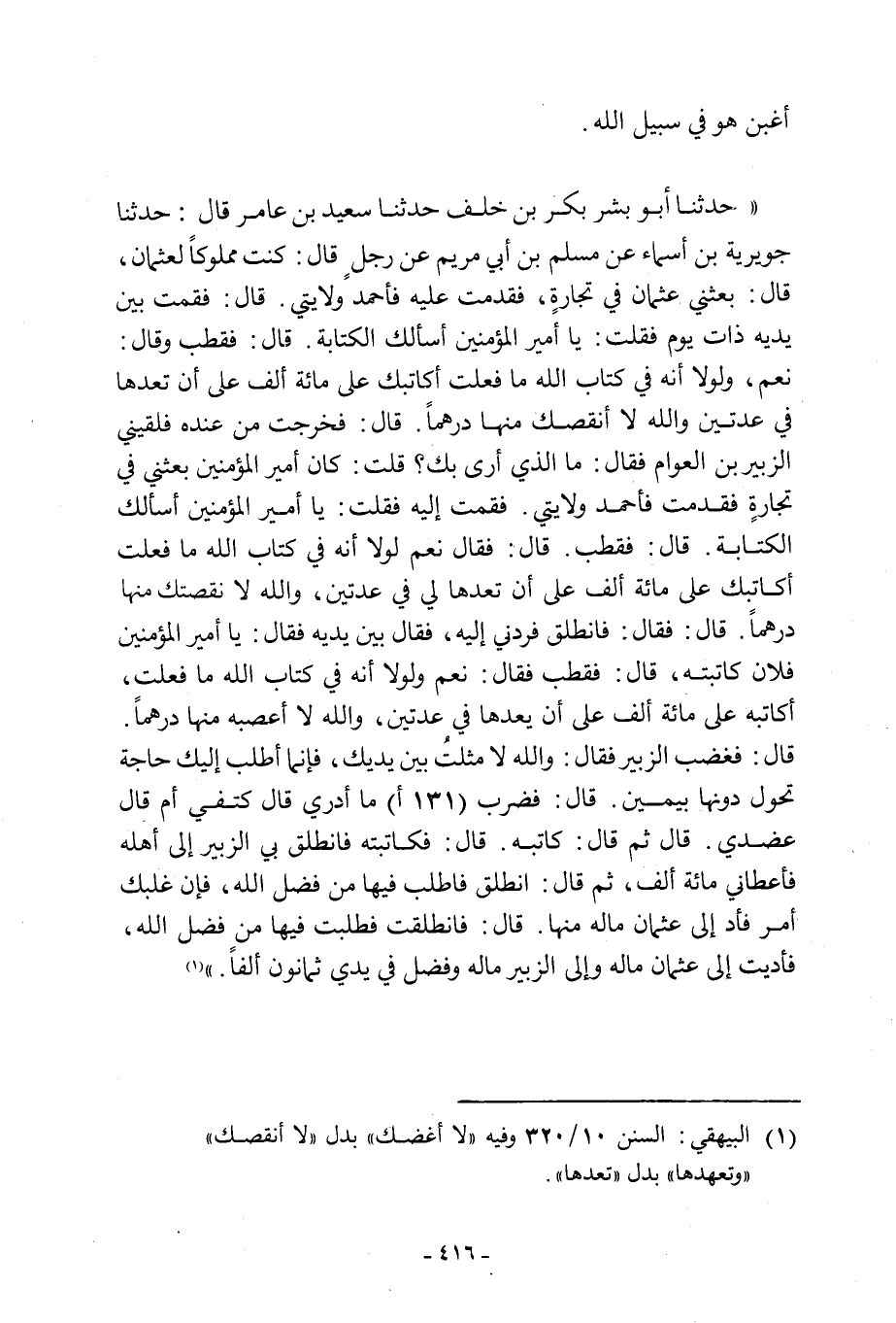 نَعَمْ، وَلَوْلَا أَنَّهُ فِي كِتَابِ اللَّهِ مَا فَعَلْتُ أُكَاتِبُكَ عَلَى مِائَةِ أَلْفٍ عَلَى أَنْ تَعُدَّهَا فِي عَدَّتَيْنِ وَاللَّهِ لَا أَنْقُصُكَ مِنْهَا دِرْهَمًا. قَالَ: فَخَرَجْتُ مِنْ عِنْدِهِ فَلَقِيَنِي الزُّبَيْرُ بْنُ الْعَوَّامِ فَقَالَ: مَا الَّذِي أَرَى بِكَ؟ قُلْتُ: كَانَ أَمِيرُ الْمُؤْمِنِينَ بَعَثَنِي فِي تِجَارَةٍ فَقَدِمْتُ فَأَحْمَدَ وِلَايَتِي. فَقُمْتُ إِلَيْهِ فَقُلْتُ: يَا أَمِيرَ الْمُؤْمِنِينَ أَسْأَلُكَ الْكِتَابَةَ. قَالَ: فَقَطَّبَ. قَالَ: فَقَالَ نَعَمْ لَوْلَا أَنَّهُ فِي كِتَابِ اللَّهِ مَا فَعَلْتُ أُكَاتِبُكَ عَلَى مِائَةِ أَلْفٍ على أن تعدها لي في عدتين، والله لا نقصتك مِنْهَا دِرْهَمًا.