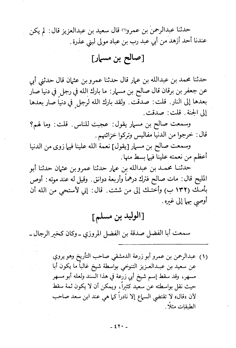 [1] عَبْدُ الرَّحْمَنِ بْنُ عَمْرٍو أَبُو زُرْعَةَ الدِّمَشْقِيُّ صاحب التأريخ وهو يروي عن سعيد بن عبد العزيز التنوخي بواسطة شيخ غالبا ما يكون أبا مسهر، وقد سقط اسم شيخ أبي زرعة في هذا السند ولعله ابو مسهر حيث نقل بواسطته عن سعيد كثيرا، ويمكن أن لا يكون ثمة سقط لان «قال» لا تقتضي السماع الا نادرا كما هي عند ابن سعد صاحب الطبقات مثلا.