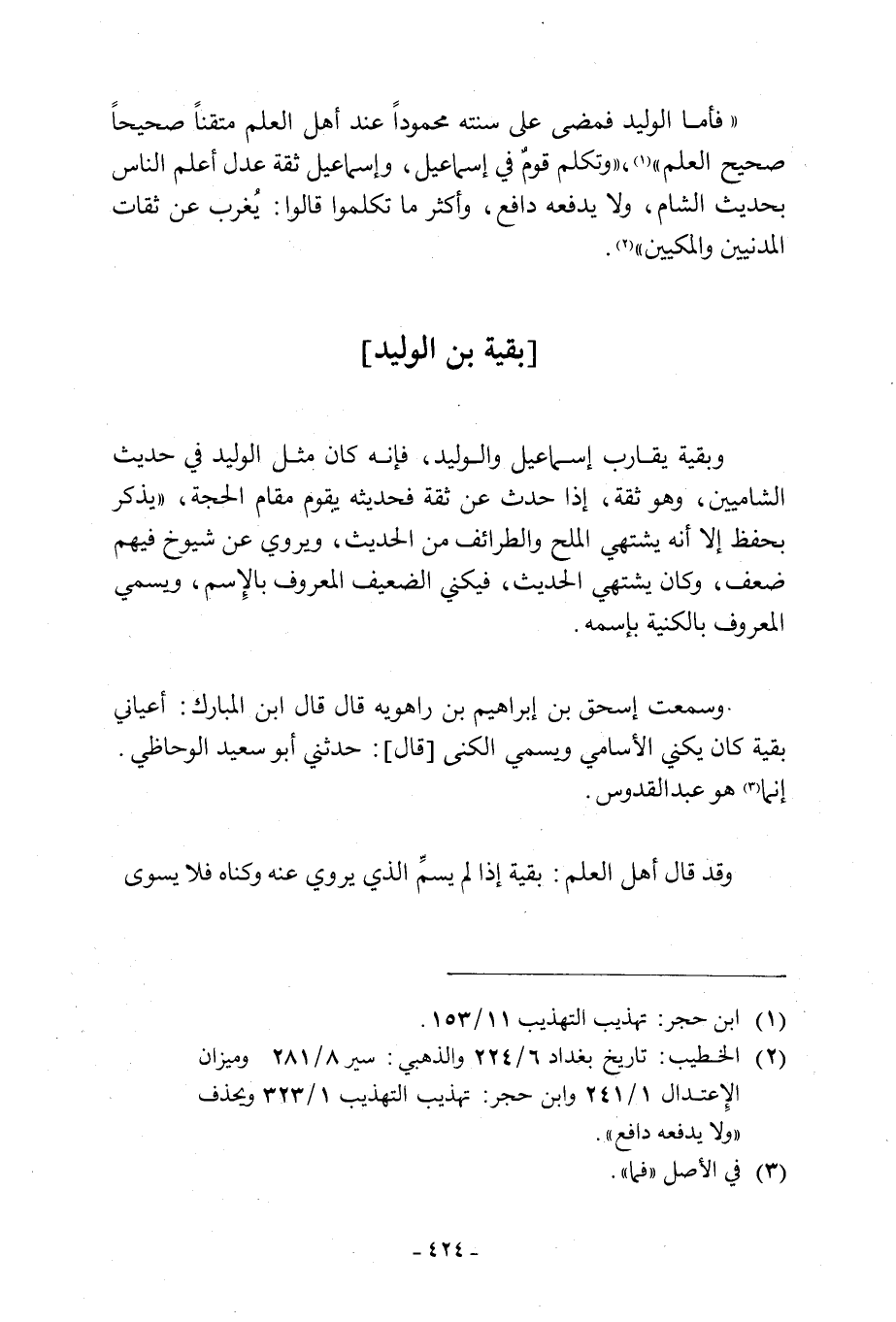 وَبَقِيَّةُ يُقَارِبُ إِسْمَاعِيلَ وَالْوَلِيدَ، فَإِنْ كَانَ مِنَ الْوَلِيدِ فِي حَدِيثِ الشَّامِيِّينَ، وَهُوَ ثِقَةٌ، إِذَا حَدَّثَ عَنْ ثِقَةٍ فحديثه يقوم مَقَامَ الْحُجَّةِ، «يُذْكَرُ بِحِفْظٍ إِلَّا أَنَّهُ يَشْتَهِيَ الْمُلَحَ وَالطَّرَائِفَ مِنَ الْحَدِيثِ، وَيَرْوِي عَنْ شُيُوخٍ فِيهِمْ ضَعْفٌ، وَكَانَ يَشْتَهِي الْحَدِيثَ، فَيُكَنِّي الضَّعِيفَ الْمَعْرُوفَ بِالِاسْمِ، وَيُسَمِّي الْمَعْرُوفَ بِالْكُنْيَةِ بِاسْمِهِ.