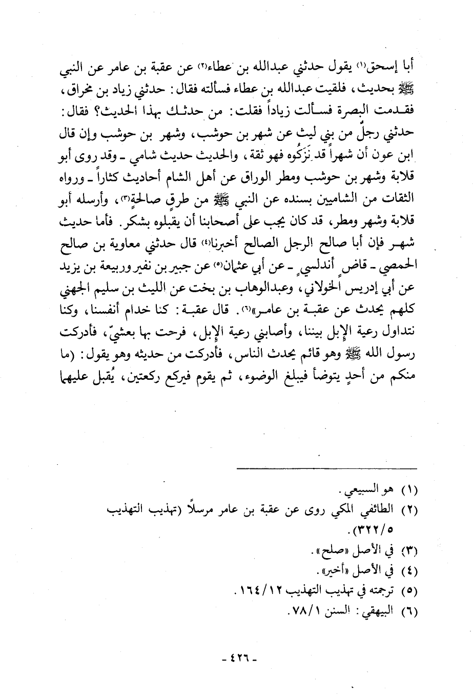 أَبَا إِسْحَاقَ [1] يَقُولُ حَدَّثَنِي عَبْدُ اللَّهِ بْنُ عَطَاءٍ [2] عَنْ عُقْبَةَ بْنِ عَامِرٍ عَنِ النَّبِيِّ صَلَّى اللَّهُ عَلَيْهِ وَسَلَّمَ بِحَدِيثٍ، فَلَقِيتُ عَبْدَ اللَّهِ بْنَ عَطَاءٍ فَسَأَلْتُهُ فَقَالَ: حَدَّثَنِي زِيَادُ بْنُ مِخْرَاقٍ، فَقَدِمْتُ الْبَصْرَةَ فَسَأَلْتُ زِيَادًا فَقُلْتُ: مَنْ حَدَّثَكَ بِهَذَا الْحَدِيثِ؟ فَقَالَ: حَدَّثَنِي رَجُلٌ مِنْ بَنِي لَيْثٍ عَنْ شَهْرِ بْنِ حَوْشَبٍ، وشهر ابن حَوْشَبٍ وَإِنْ قَالَ ابْنُ عَوْنٍ أَنَّ شَهْرًا قَدْ تَرَكُوهُ فَهُوَ ثِقَةٌ، وَالْحَدِيثُ حَدِيثٌ شَامِيٌّ- وَقَدْ رَوَى أَبُو قِلَابَةَ وَشَهْرُ بْنُ حَوْشَبٍ وَمَطَرٌ الْوَرَّاقُ عَنْ أَهْلِ الشَّامِ أَحَادِيثَ كِثَارًا- رواه الثِّقَاتُ مِنَ الشَّامِيِّينَ بِسَنَدِهِ عَنِ النَّبِيِّ صَلَّى اللَّهُ عَلَيْهِ وَسَلَّمَ مِنْ طُرُقٍ صَالِحَةٍ [3] ، وَأَرْسَلَهُ أَبُو قِلَابَةَ وَشَهْرٌ وَمَطَرٌ، قَدْ كَانَ يَجِبُ عَلَى أَصْحَابِنَا أَنْ يَقْبَلُوهُ بِشُكْرٍ. فَأَمَّا حَدِيثُ شَهْرٍ فَإِنَّ أَبَا صَالِحٍ الرَّجُلُ الصَّالِحُ أَخْبَرَنَا [4] قَالَ حَدَّثَنِي مُعَاوِيَةُ بْنُ صَالِحٍ الْحِمْصِيُّ- قَاضٍ أَنْدَلُسِيٌّ- عَنْ أَبِي عُثْمَانَ [5] عَنْ جُبَيْرِ بْنِ نُفَيْرٍ وَرَبِيعَةَ بْنِ يَزِيدَ عَنْ أَبِي إِدْرِيسَ الْخَوْلَانِيَّ، وَعَبْدِ الْوَهَّابِ بْنِ بُخْتٍ عَنِ اللَّيْثِ بْنِ سُلَيْمٍ الْجُهَنِيِّ كُلُّهُمْ يُحَدِّثُ عَنْ عُقْبَةَ بْنِ عَامِرٍ. قَالَ عُقْبَةُ: كُنَّا خُدَّامَ أَنْفُسِنَا، وَكُنَّا نَتَدَاوَلُ رَعْيَةَ الْإِبِلِ بَيْنَنَا، وَأَصَابَنِي رَعْيَةُ الْإِبِلِ، فَرُحْتُ بِهَا بِعَشِيٍّ، فَأَدْرَكْتُ رَسُولَ اللَّهِ صَلَّى اللَّهُ عَلَيْهِ وَسَلَّمَ وَهُوَ قَائِمٌ يُحَدِّثُ النَّاسَ، فَأَدْرَكْتُ مِنْ حَدِيثِهِ وَهُوَ يَقُولُ: