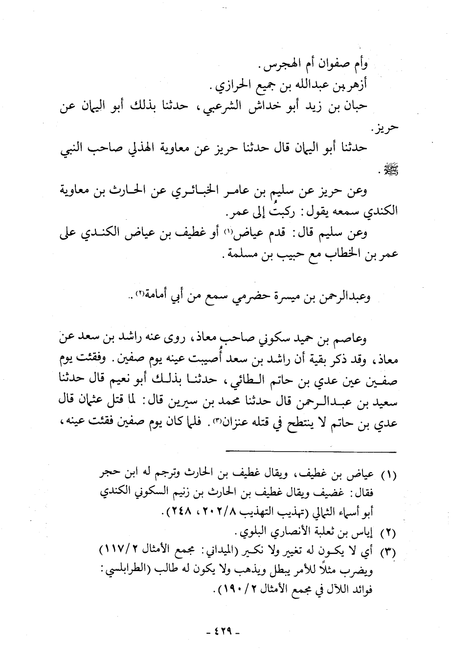 وَعَاصِمُ بْنُ حُمَيْدٍ سَكُونِيٌّ صَاحِبُ مُعَاذٍ، رَوَى عَنْهُ رَاشِدُ بْنُ سَعْدٍ عَنْ مُعَاذٍ، وَقَدْ ذَكَرَ بَقِيَّةُ أَنَّ رَاشِدَ بْنَ سَعْدٍ أُصِيبَتْ عَيْنُهُ يَوْمَ صِفِّينَ. وَفُقِئَتْ يَوْمَ صِفِّينَ عَيْنُ عَدِيِّ بْنِ حَاتِمٍ الطَّائِيُّ، حَدَّثَنَا بِذَلِكَ أَبُو نُعَيْمٍ قَالَ حدثنا سعيد ابن عَبْدِ الرَّحْمَنِ قَالَ حَدَّثَنَا مُحَمَّدُ بْنُ سِيرِينَ قال: لما قتل عثمان قال عدي ابن حَاتِمٍ لَا يَنْتَطِحُ فِي قَتْلِهِ عَنْزَانِ [3] . فَلَمَّا كان يوم صفين فقئت عينه،
