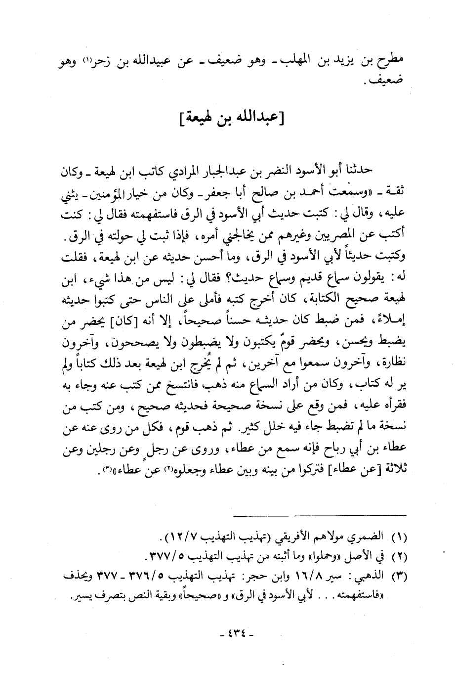 حَدَّثَنَا أَبُو الْأَسْوَدِ النَّضْرُ بْنُ عَبْدِ الْجَبَّارِ الْمُرَادِيُّ كَاتِبُ ابْنُ لَهِيعَةَ- وَكَانَ ثِقَةً- «وَسَمِعْتُ أَحْمَدَ بْنَ صَالِحٍ أَبَا جَعْفَرٍ- وَكَانَ مِنْ خِيَارِ الْمُتْقِنِينَ- يُثْنِي عَلَيْهِ، وَقَالَ لِي: كَتَبْتُ حَدِيثَ أَبِي الْأَسْوَدِ فِي الرَّقِّ فَاسْتَفْهَمْتُهُ فَقَالَ لِي: كُنْتُ أَكْتُبُ عَنِ الْمِصْرِيِّينَ وَغَيْرِهِمْ مِمَّنْ يُخَالِجُنِي أَمْرُهُ، فَإِذَا ثبت لي حولته في الرق. وكتبت حَدِيثًا لِأَبِي الْأَسْوَدِ فِي الرَّقِّ، وَمَا أَحْسَنَ حَدِيثَهُ عَنِ ابْنِ لَهِيعَةَ، فَقُلْتُ لَهُ: يَقُولُونَ سَمَاعٌ قَدِيمٌ وَسَمَاعٌ حَدِيثٌ؟ فَقَالَ لِي: لَيْسَ مِنْ هَذَا شَيْءٌ، ابْنُ لَهِيعَةَ صَحِيحُ الْكِتَابَةِ، كَانَ أَخْرَجَ كُتُبَهُ فَأَمْلَى عَلَى النَّاسِ حَتَّى كَتَبُوا حَدِيثَهُ إِمْلَاءً، فَمَنْ ضَبَطَ كَانَ حَدِيثُهُ حَسَنًا صَحِيحًا، إِلَّا أَنَّهُ [كَانَ] يَحْضُرُ مَنْ يَضْبِطُ وَيُحْسِنُ، وَيَحْضُرُ قَوْمٌ يَكْتُبُونَ وَلَا يَضْبِطُونَ وَلَا يُصَحِّحُونَ، وَآخَرُونَ نَظَّارَةٌ، وَآخَرُونَ سَمِعُوا مَعَ آخَرِينَ، ثُمَّ لَمْ يُخْرِجَ ابْنُ لَهِيعَةَ بَعْدَ ذَلِكَ كِتَابًا وَلَمْ يُرَ لَهُ كِتَابٌ، وَكَانَ مَنْ أَرَادَ السَّمَاعَ مِنْهُ ذَهَبَ فَانْتَسَخَ مِمَّنْ كَتَبَ عَنْهُ وَجَاءَ بِهِ فَقَرَأَهُ عَلَيْهِ، فَمَنْ وَقَعَ عَلَى نُسْخَةٍ صَحِيحَةٍ فَحَدِيثُهُ صَحِيحٌ، وَمَنْ كَتَبَ مِنْ نُسْخَةٍ مَا لَمْ تُضْبَطْ جَاءَ فِيهِ خَلَلٌ كَثِيرٌ. ثُمَّ ذَهَبَ قَوْمٌ، فَكُلُّ مَنْ رَوَى عَنْهُ عَنْ عَطَاءِ بْنِ أَبِي رَبَاحٍ فَإِنَّهُ سَمِعَ مِنْ عَطَاءٍ، وَرَوَى عَنْ رَجُلٍ وَعَنْ رَجُلَيْنِ وَعَنْ ثَلَاثَةٍ [عَنْ عَطَاءٍ] فَتَرَكُوا مَنْ بَيْنَهُ وَبَيْنَ عَطَاءٍ وَجَعَلُوهُ [2] عَنْ عطاء» [3] .