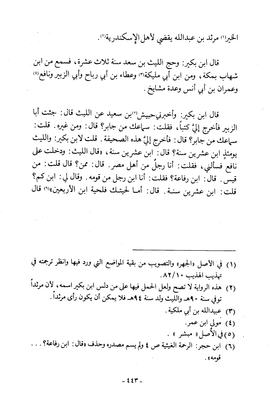 [2] هذه الرواية لا تصح ولعل الحمل فيها على من دلس ابن بكير اسمه، لان مرثدا توفي سنة 90 هـ والليث ولد سنة 94 هـ فلا يمكن أن يكون رأى مرثدا.