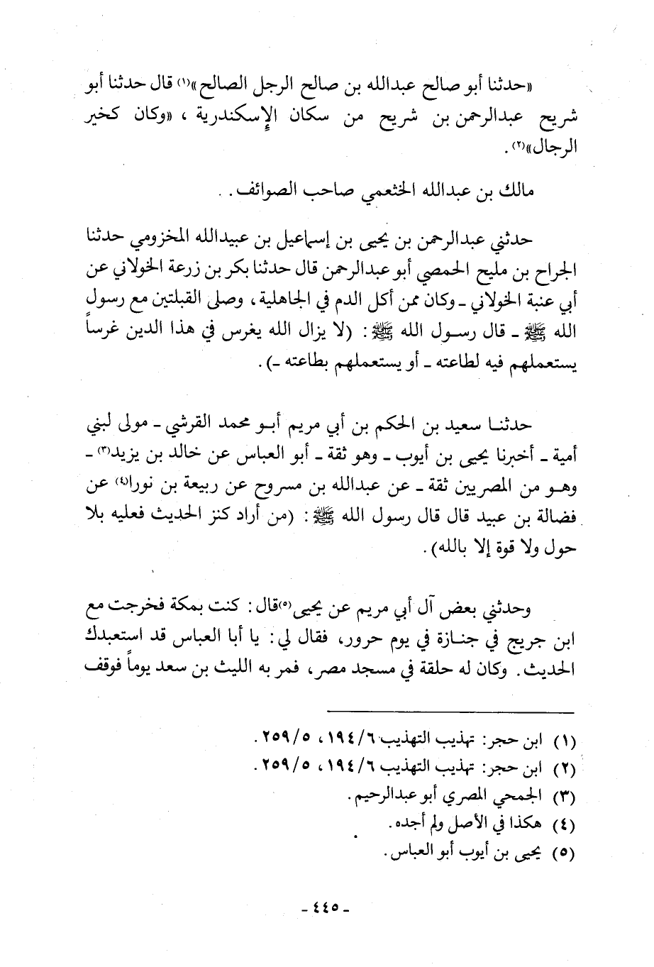 حدثني عبد الرحمن بن يحي بْنِ إِسْمَاعِيلَ بْنِ عُبَيْدِ اللَّهِ الْمَخْزُومِيُّ حَدَّثَنَا الْجَرَّاحُ بْنُ مَلِيحٍ الْحِمْصِيُّ أَبُو عَبْدِ الرَّحْمَنِ قَالَ حَدَّثَنَا بَكْرُ بْنُ زُرْعَةَ الْخَوْلَانِيُّ عَنْ أبي عنبة الْخَوْلَانِيِّ- وَكَانَ مِمَّنْ أَكَلَ الدَّمَ فِي الْجَاهِلِيَّةِ، وَصَلَّى الْقِبْلَتَيْنِ مَعَ رَسُولِ اللَّهِ صَلَّى اللَّهُ عَلَيْهِ وَسَلَّمَ- قَالَ رَسُولُ اللَّهِ صَلَّى اللَّهُ عَلَيْهِ وَسَلَّمَ: (لَا يَزَالُ اللَّهُ يَغْرِسُ فِي هَذَا الدِّينِ غَرْسًا يَسْتَعْمِلْهُمْ فِيهِ لِطَاعَتِهِ- أَوْ يَسْتَعْمِلْهُمْ بِطَاعَتِهِ-) . حَدَّثَنَا سَعِيدُ بْنُ الْحَكَمِ بْنِ أبي مريم ابو محمد القرشي- مولى لبني أمية- أخبرنا يحي بْنُ أَيُّوبَ- وَهُوَ ثِقَةٌ- أَبُو الْعَبَّاسِ عَنْ خَالِدِ بْنِ يَزِيدَ [3]- وَهُوَ مِنَ الْمِصْرِيِّينَ ثِقَةٌ- عَنْ عَبْدِ اللَّهِ بْنِ مَسْرُوحٍ عَنْ رَبِيعَةَ بن نُورَا [4] عَنْ فَضَالَةَ بْنِ عُبَيْدٍ قَالَ قَالَ رسول الله صلى الله عليه وسلم: «من أَرَادَ كَنْزَ الْحَدِيثِ فَعَلَيْهِ بِلَا حَوْلَ وَلَا قوة الا باللَّه» . وحدثني بعض آل أبي مريم عن يحي [5] قَالَ: كُنْتُ بِمَكَّةَ فَخَرَجْتُ مَعَ ابْنِ جُرَيْجٍ فِي جِنَازَةٍ فِي يَوْمٍ حَرُورٍ، فَقَالَ لِي: يَا أَبَا الْعَبَّاسِ قَدِ اسْتَعْبَدَكَ الْحَدِيثُ. وَكَانَ لَهُ حَلْقَةٌ فِي مَسْجِدِ مِصْرَ، فَمَرَّ بِهِ الليث بن سعد يوما