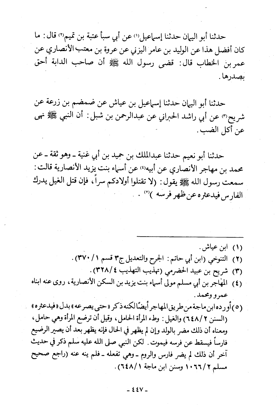 حَدَّثَنَا أَبُو الْيَمَانِ حَدَّثَنَا إِسْمَاعِيلُ بْنُ عياش عن ضمضم بن زرعة عن شريح [3] عَنْ أَبِي رَاشِدٍ الْحَبْرَانِيِّ عَنْ عَبْدِ الرَّحْمَنِ بن شبل: أن النبي صلى الله عليه وَسَلَّمَ نَهَى عَنْ أَكْلِ الضَّبِّ. حَدَّثَنَا أَبُو نُعَيْمٍ حَدَّثَنَا عَبْدُ الْمَلِكِ بْنُ حُمَيْدِ بْنِ أَبِي غَنِيَّةَ- وَهُوَ ثِقَةٌ- عَنْ مُحَمَّدِ بْنِ مُهَاجِرٍ الْأَنْصَارِيِّ عَنْ أَبِيهِ [4] عَنْ أَسْمَاءَ بِنْتِ يَزيِدَ الْأَنْصَارِيَّةَ قَالَتْ: سَمِعْتُ رَسُولَ اللَّهِ صَلَّى اللَّهُ عَلَيْهِ وَسَلَّمَ يَقُولُ: «لَا تَقْتُلُوا أَوْلَادَكُمْ سِرًا، فَإِنَّ قَتْلَ الْغَيْلَ يُدْرِكُ الْفَارِسَ فَيُدَعْنهُ عن ظهر فرسه) [5] .