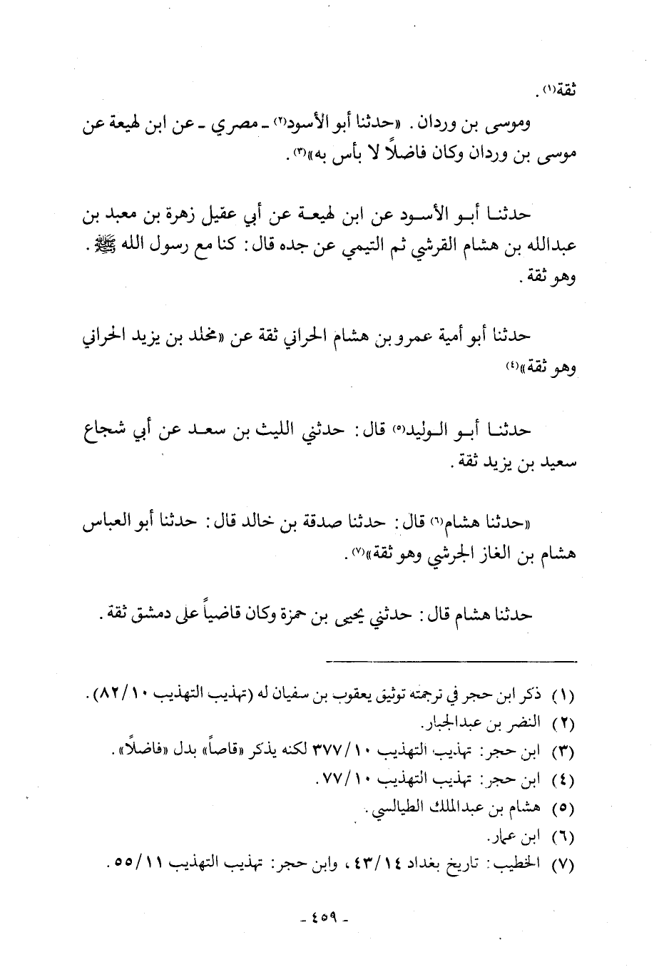 [7] الخطيب: تاريخ بغداد 14/ 43، وابن حجر: تهذيب التهذيب 11/ 55.