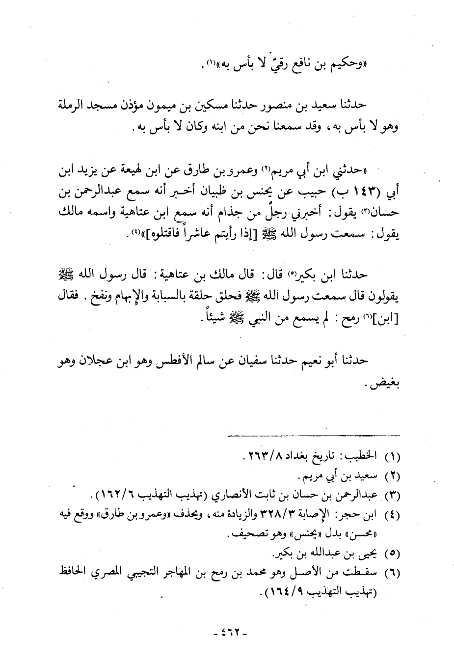 «حَدَّثَنِي ابْنُ أَبِي مَرْيَمَ [2] وَعَمْرُو بْنُ طَارِقٍ عَنِ ابْنِ لَهِيعَةَ عَنْ يزيد ابن أبي (143 ب) حَبِيبٍ عَنْ يَحْنَسَ بْنِ ظَبْيَانَ أَخْبَرَ أَنَّهُ سمع عبد الرحمن ابن حَسَّانٍ [3] يَقُولُ: أَخْبَرَنِي رَجُلٌ مِنْ جُذَامَ أَنَّهُ سَمِعَ ابْنَ عَتَاهِيَةَ وَاسْمُهُ مَالِكٌ يَقُولُ: سَمِعْتُ رسول الله صلى الله عليه وسلم [إذا رَأَيْتُمْ عَاشِرًا فَاقْتُلُوهُ] » [4] . حَدَّثَنَا ابْنُ بُكَيْرٍ [5] قَالَ: قَالَ مَالِكُ بْنُ عَتَاهِيَةَ: قَالَ رَسُولُ اللَّهِ صَلَّى اللَّهُ عَلَيْهِ وَسَلَّمَ يَقُولُونَ قَالَ سَمِعْتُ رَسُولَ اللَّهِ صَلَّى اللَّهُ عَلَيْهِ وَسَلَّمَ فَحَلَّقَ حَلْقَةً بِالسَّبَّابَةِ وَالْإِبْهَامِ وَنَفَخَ. فَقَالَ [ابْنُ] [6] رُمْحٍ: لَمْ يَسْمَعْ مِنَ النَّبِيِّ صَلَّى اللَّهُ عَلَيْهِ وَسَلَّمَ شَيْئًا.