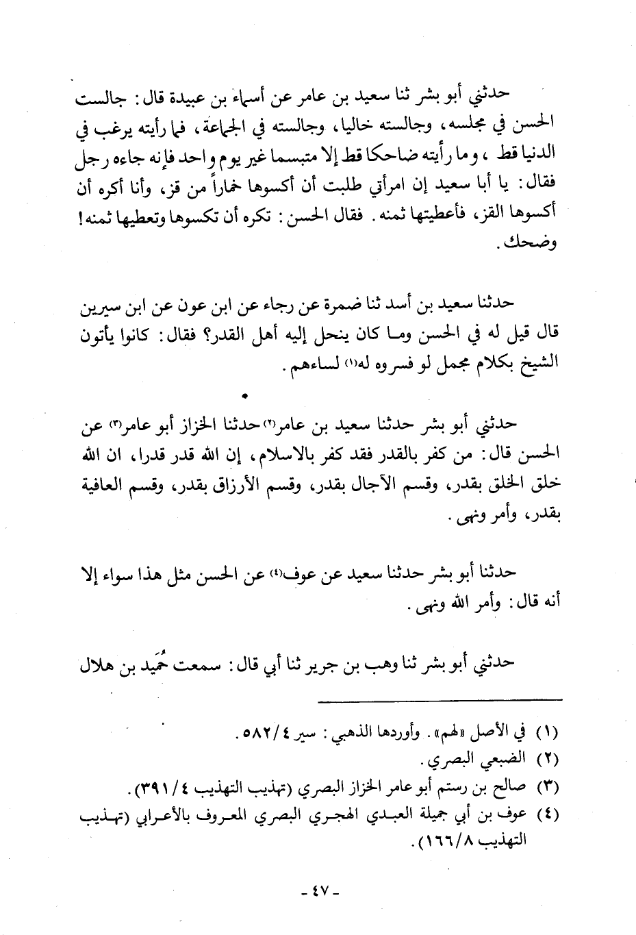 حَدَّثَنِي أَبُو بِشْرٍ حَدَّثَنَا سَعِيدُ بْنُ عَامِرٍ [2] حَدَّثَنَا الْخَزَّازُ أَبُو عَامِرٍ [3] عَنِ الْحَسَنِ قَالَ: مَنْ كَفَرَ بِالْقَدَرِ فَقَدْ كَفَرَ بِالْإِسْلَامِ، إِنَّ اللَّهَ قَدَّرَ قَدَرًا، إِنَّ اللَّهَ خَلَقَ الْخَلْقَ بِقَدَرٍ، وَقَسَّمَ الْآجَالَ بِقَدَرٍ، وَقَسَّمَ الْأَرْزَاقَ بِقَدَرٍ، وَقَسَّمَ الْعَافِيَةَ بِقَدَرٍ، وَأَمَرَ وَنَهَى.