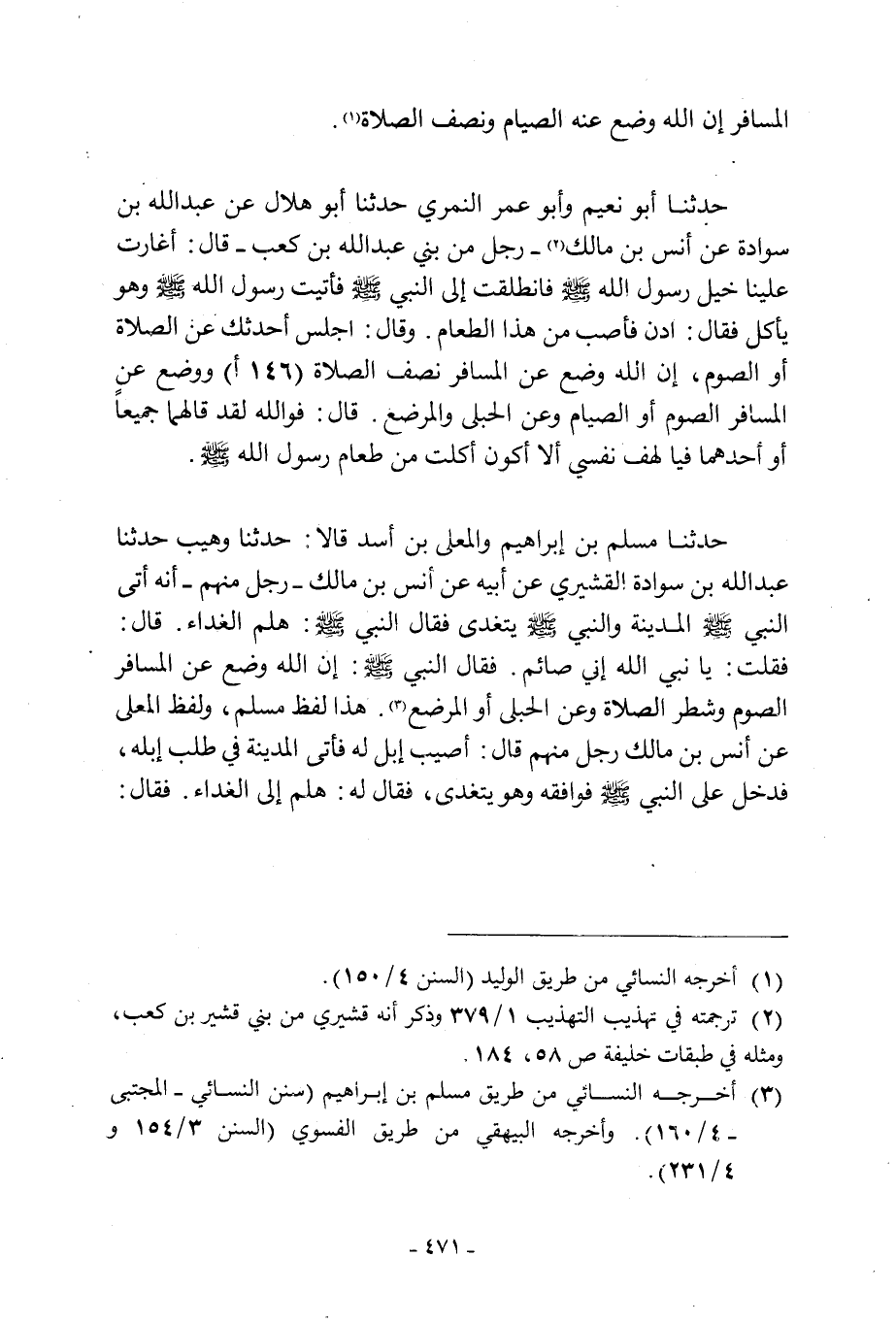 حَدَّثَنَا مُسْلِمُ بْنُ إِبْرَاهِيمَ وَالْمُعَلَّى بْنُ أَسَدٍ قَالا: حَدَّثَنَا وُهَيْبٌ حَدَّثَنَا عَبْدُ اللَّهِ بْنُ سَوَادَةَ الْقُشَيْرِيُّ عَنْ أَبِيهِ عَنْ أَنَسِ بْنِ مَالِكٍ- لِرَجُلٍ مِنْهُمْ- أَنَّهُ أَتَى النَّبِيَّ صَلَّى اللَّهُ عَلَيْهِ وَسَلَّمَ الْمَدِينَةَ وَالنَّبِيُّ صَلَّى اللَّهُ عَلَيْهِ وَسَلَّمَ يَتَغَدَّى فَقَالَ النَّبِيُّ صَلَّى اللَّهُ عَلَيْهِ وَسَلَّمَ: هَلُمَّ الْغَدَاءَ. قَالَ: فَقُلْتُ: يَا نَبِيَّ اللَّهِ إِنِّي صَائِمٌ. فَقَالَ النَّبِيُّ صَلَّى اللَّهُ عَلَيْهِ وَسَلَّمَ: إِنَّ اللَّهَ وَضَعَ عَنِ الْمُسَافِرِ الصَّوْمَ وَشَطْرَ الصَّلَاةِ وَعَنِ الْحُبْلَى أَوِ الْمُرْضِعِ [3] . هَذَا لَفْظُ مُسْلِمٍ، وَلَفْظُ الْمُعَلَّى عَنْ أَنَسِ بْنِ مَالِكٍ رَجُلٌ مِنْهُمْ قَالَ: أُصِيبَ إِبِلٌ لَهُ فَأَتَى الْمَدِينَةَ فِي طَلَبِ إِبِلِهِ، فَدَخَلَ عَلَى النَّبِيِّ صَلَّى اللَّهُ عَلَيْهِ وَسَلَّمَ فَوَافَقَهُ وَهُوَ يتغدى، فقال له: