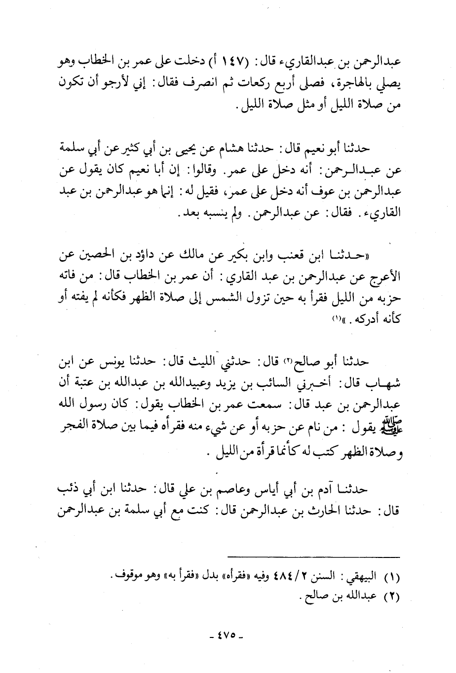 حَدَّثَنَا أَبُو صَالِحٍ [1] قَالَ: حَدَّثَنِي اللَّيْثُ قَالَ: حَدَّثَنَا يُونُسُ عَنِ ابْنِ شِهَابٍ قَالَ: أَخْبَرَنِي السَّائِبُ بْنُ يَزِيدَ وَعُبَيْدُ اللَّهِ بْنُ عَبْدِ اللَّهِ بْنِ عُتْبَةَ أَنَّ عَبْدَ الرَّحْمَنِ بْنَ عَبْدٍ قَالَ: سَمِعْتُ عُمَرَ بْنَ الْخَطَّابِ يَقُولُ: كَانَ رَسُولُ اللَّهِ صَلَّى اللَّهُ عَلَيْهِ وسلم يقول: من نام حِزْبِهِ أَوْ عَنْ شَيْءٍ مِنْهُ فَقَرَأَهُ فِيمَا بَيْنَ صَلَاةِ الْفَجْرِ وَصَلَاةِ الظُّهْرِ كُتِبَ لَهُ كَأَنَّمَا قَرَأَهُ مِنَ اللَّيْلِ. حَدَّثَنَا آدَمُ بْنُ أَبِي إِيَاسٍ وَعَاصِمُ بْنُ عَلِيٍّ قَالَ: حَدَّثَنَا ابْنُ أَبِي ذِئْبٍ قَالَ: حَدَّثَنَا الْحَارِثُ بْنُ عَبْدِ الرَّحْمَنِ قَالَ: كُنْتُ مَعَ أَبِي سَلَمَةَ بن عبد الرحمن