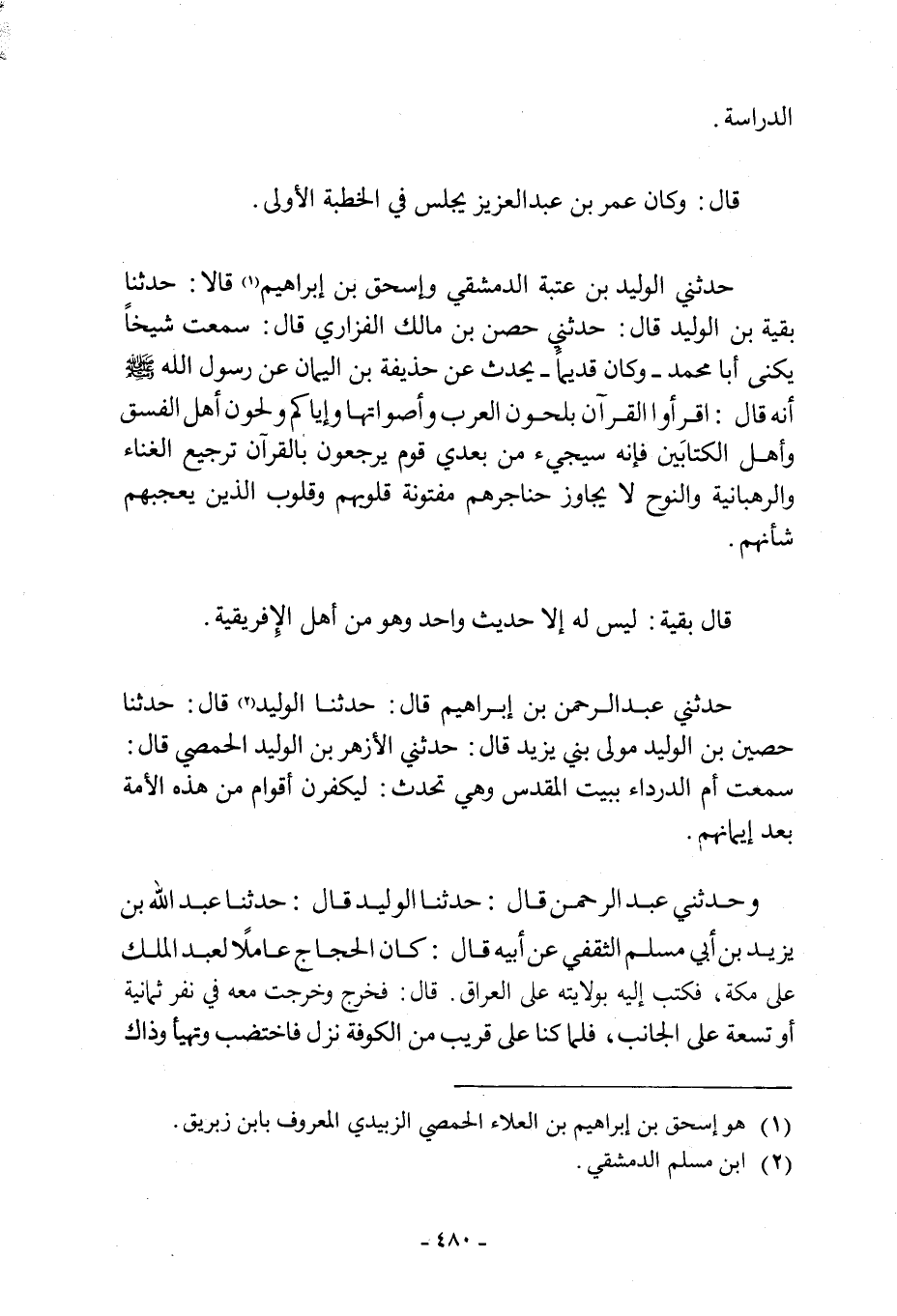 حَدَّثَنِي الْوَلِيدُ بْنُ عُتْبَةَ الدِّمَشْقِيُّ وَإِسْحَاقُ بْنُ إِبْرَاهِيمَ [1] قَالا: حَدَّثَنَا بَقِيَّةُ بْنُ الْوَلِيدِ قَالَ: حَدَّثَنِي حِصْنُ بْنُ مَالِكٍ الْفَزَارِيُّ قَالَ: سَمِعْتُ شَيْخًا يُكَنَى أَبَا مُحَمَّدٍ- وَكَانَ قَدِيمًا- يُحَدِّثُ عَنْ حُذَيْفَةَ بْنِ الْيَمَانِ عَنْ رَسُولِ اللَّهِ صَلَّى الله عليه وسلم انه قال: اقرأوا الْقُرْآنَ بِلُحُونِ الْعَرَبِ وَأَصْوَاتِهَا وَإِيَّاكُمْ وَلَحْنَ أَهْلِ الْفِسْقِ وَأَهْلِ الْمَكَايِسِ فَإِنَّهُ سَيَجِيءُ مِنْ بَعْدِي قَوْمٌ يُرَجِّعُونَ بِالْقُرْآنِ تَرْجِيعَ الْغِنَاءِ وَالرَّهْبَانِيَّةِ وَالنَّوْحِ لَا يُجَاوِزُ حَنَاجِرَهُمْ مَفْتُونَةٌ قُلُوبُهُمْ وَقُلُوبُ الَّذِينَ يُعْجِبُهُمْ شَأْنُهُمْ. قَالَ بَقِيَّةُ: لَيْسَ لَهُ إِلَّا حَدِيثٌ وَاحِدٌ وَهُوَ مِنْ أَهْلِ الْإِفْرِيقِيَّةِ.