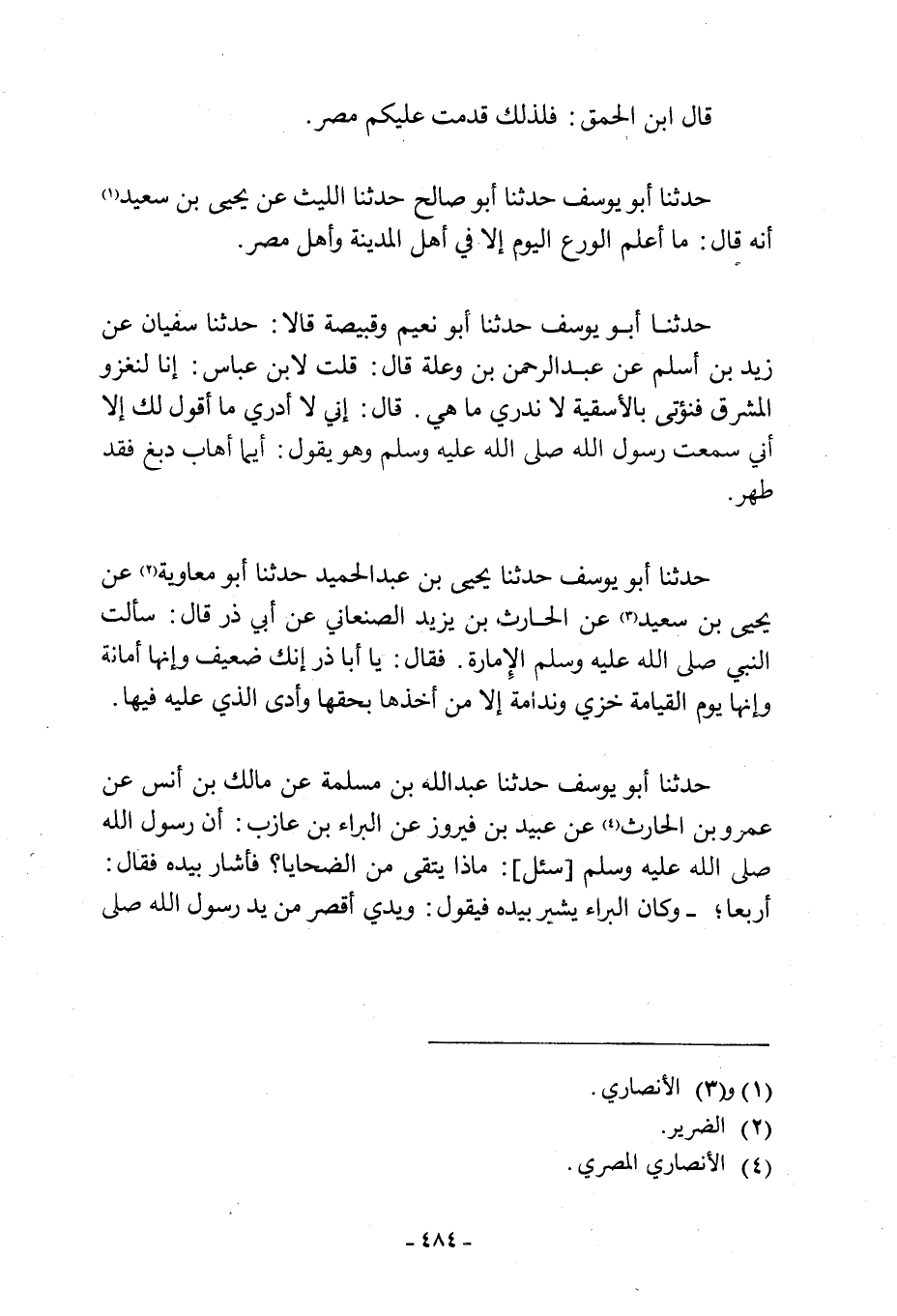 حَدَّثَنَا أَبُو يُوسُفَ حَدَّثَنَا أَبُو نُعَيْمٍ وَقَبِيصَةُ قَالا: حدثنا سفيان عن زيد ابن أَسْلَمَ عَنْ عَبْدِ الرَّحْمَنِ بْنِ وَعْلَةَ قَالَ: قلت لابن عباس: انا لنغزو الْمَشْرِقَ فَنُؤْتَي بِالْأَسْقِيَةِ لَا نَدْرِي مَا هِيَ. قَالَ: إِنِّي لَا أَدْرِي مَا أَقُولُ لَكَ إِلَّا أَنِّي سَمِعْتُ رَسُولَ اللَّهِ صَلَّى اللَّهُ عَلَيْهِ وَسَلَّمَ وَهُوَ يَقُولُ: «أَيُّمَا إِهَابٍ دُبِغَ فقد طهر. حدثنا ابو يوسف حدثنا يحي بْنُ عَبْدِ الْحَمِيدِ حَدَّثَنَا أَبُو مُعَاوِيَةَ [2] عَنْ يحي بن سعيد [3] عن الحارث بْنِ يَزِيدَ الْصَنْعَانِيِّ عَنْ أَبِي ذَرٍّ قَالَ: سَأَلْتُ النَّبِيَّ صَلَّى اللَّهُ عَلَيْهِ وَسَلَّمَ الْإِمَارَةَ. فَقَالَ: يَا أَبَا ذَرٍّ إِنَّكَ ضَعِيفٌ وَإِنَّهَا أَمَانَةٌ وَإِنَّهَا يَوْمَ الْقِيَامَةِ خِزْيٌ وَنَدَامَةٌ إِلَّا مَنْ أَخَذَهَا بِحَقِّهَا وَأَدَّى الَّذِي عَلَيْهِ فِيهَا. حَدَّثَنَا أَبُو يُوسُفَ حَدَّثَنَا عَبْدُ اللَّهِ بْنُ مَسْلَمَةَ عَنْ مَالِكِ بْنِ أَنَسٍ عَنْ عَمْرِو بْنِ الْحَارِثِ [4] عَنْ عُبَيْدِ بْنِ فَيْرُوزَ عَنِ الْبَرَاءِ بْنِ عَازِبٍ: أَنّ رَسُولَ اللَّهِ صَلَّى اللَّهُ عَلَيْهِ وَسَلَّمَ [سُئِلَ] : مَاذَا يُتَّقَى مِنَ الضَّحَايَا؟ فَأَشَارَ بِيَدِهِ فَقَالَ: أَرْبعًا، - وَكَانَ الْبَرَاءُ يُشِيرُ بِيَدِهِ فَيَقُولُ: وَيَدِي أَقْصَرُ مِنْ يَدِ رسول