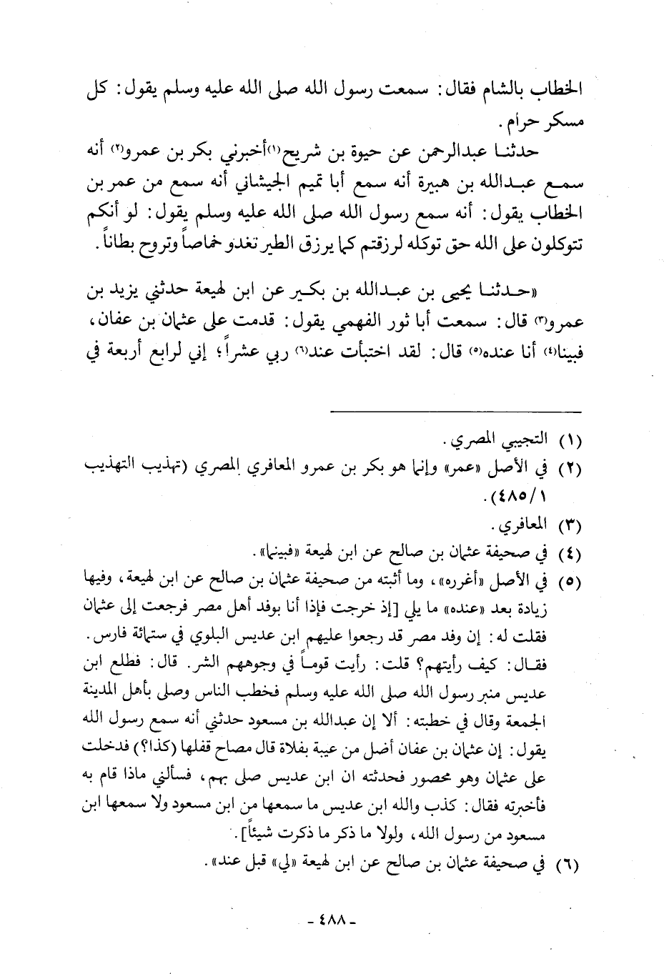 يَقُولُ: كُلُّ مُسْكِرٍ حَرَامٌ. حَدَّثَنَا عَبْدُ الرَّحْمَنِ عَنْ حَيْوَةَ بْنِ شُرَيْحٍ [1] أَخْبَرَنِي بَكْرُ بْنُ عَمْرٍو [2] أَنَّهُ سَمِعَ عَبْدَ اللَّهِ بْنَ هُبَيْرَةَ أَنَّهُ سَمِعَ أَبَا تَمِيمٍ الْجَيْشَانِيَّ أَنَّهُ سَمِعَ من عُمَرَ بْنِ الْخَطَّابِ يَقُولُ: أَنَّهُ سَمِعَ رَسُولَ اللَّهِ صَلَّى اللَّهُ عَلَيْهِ وَسَلَّمَ يَقُولُ: لَوْ انكم تتوكلون عَلَى اللَّهِ حَقَّ تَوَكُّلِهِ لَرُزِقْتُمْ كَمَا يُرْزَقُ الطير تغدو أخماصا وتروح بطانا. «حدثنا يحي بْنُ عَبْدِ اللَّهِ بْنُ بُكَيْرٍ عَنِ ابْنِ لَهِيعَةَ حَدَّثَنِي يَزِيدُ بْنُ عَمْرٍو [3] قَالَ: سَمِعْتُ أَبَا ثَوْرٍ الْفَهْمِيُّ يَقُولُ: قَدِمْتُ عَلَى عُثْمَانَ بْنِ عَفَّانٍ، فَبَيْنَا [4] أَنَا عِنْدَهُ [5] قَالَ: لَقَدِ اختبأت عند [6] ربي عشرا، اني لرابع