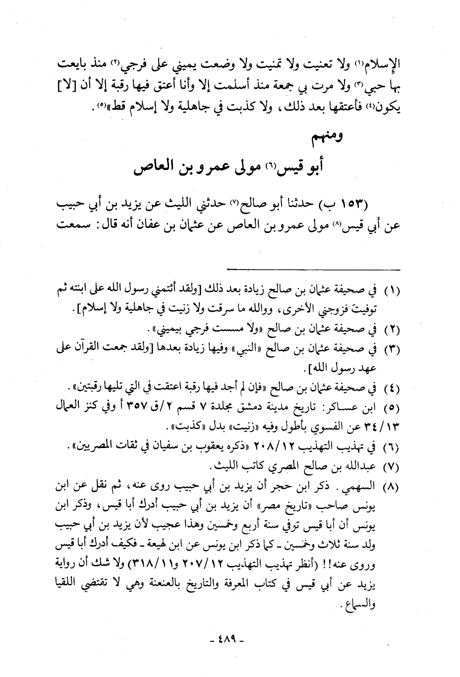 (153 ب) حَدَّثَنَا أَبُو صَالِحٍ [7] حَدَّثَنِي اللَّيْثُ عَنْ يَزِيدَ بْنِ أَبِي حَبِيبٍ عَنْ أَبِي قَيْسٍ [8] مَوْلَى عَمْرِو بْنِ الْعَاصِ عَنْ عُثْمَانَ بْنِ عَفَّانٍ انه قال: