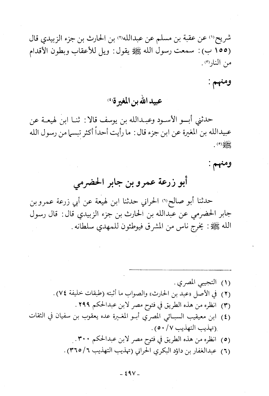 ابن شُرَيْحٍ [1] عَنْ عُقْبَةَ بْنِ مُسْلِمٍ عَنْ عَبْدِ اللَّهِ [2] بْنِ الْحَارِثِ بْنِ جَزْءٍ الزُّبَيْدِيِّ قَالَ (155 ب) : سمعت رسول الله صلى الله عليه وسلم يَقُولُ: وَيْلٌ لِلْأَعْقَابِ وَبُطُونِ الْأَقْدَامِ مِنَ النَّارِ [3] .