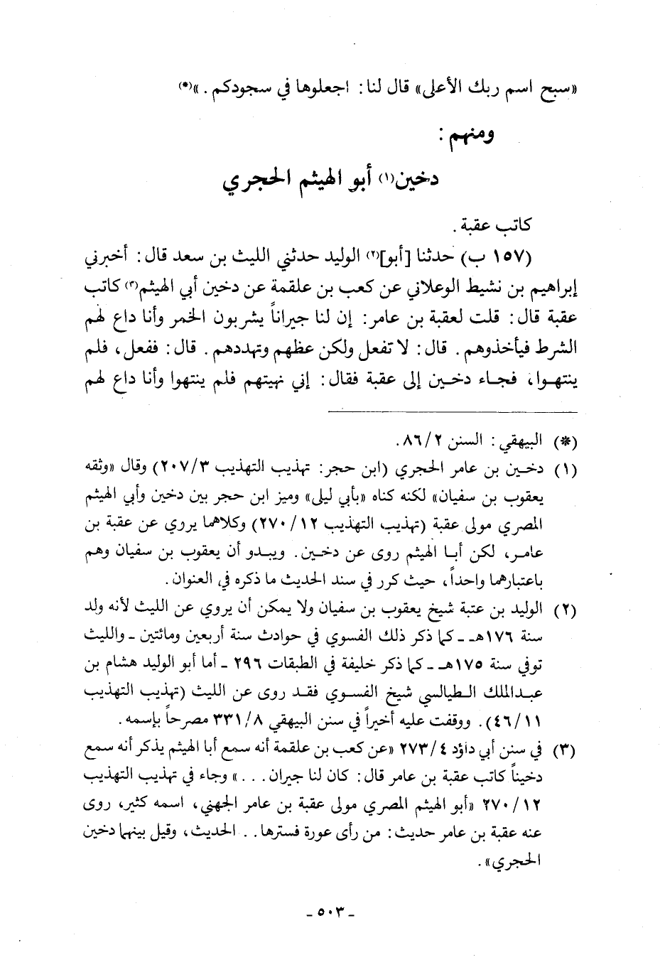 [3] في سنن أبي داود 4/ 273 «عن كعب بن علقمة انه سمع أبا الهيثم يذكر أنه سمع دخينا كاتب عقبة بن عامر قال: كان لنا جيران ... » وجاء في تهذيب التهذيب 12/ 270 «ابو الهيثم المصري مولى عقبة بن عامر الجهنيّ، اسمه كثير، روى عنه عقبة بن عامر حديث: من رأى عورة فسترها.. الحديث، وقيل بينهما دخين الحجري» .