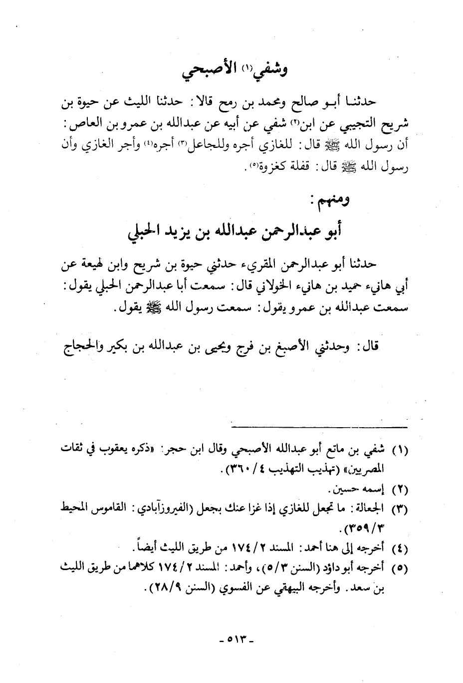 حَدَّثَنَا أَبُو صَالِحٍ وَمُحَمَّدُ بْنُ رُمْحٍ قَالا: حَدَّثَنَا اللَّيْثُ عنُ حَيْوَةَ بْنِ شُرَيْحٍ التُّجِيبِيُّ عَنِ ابْنِ [2] شُفَيٍّ عَنْ أَبِيهِ عَنْ عَبْدِ اللَّهِ بْنِ عَمْرِو بْنِ الْعَاصِ: