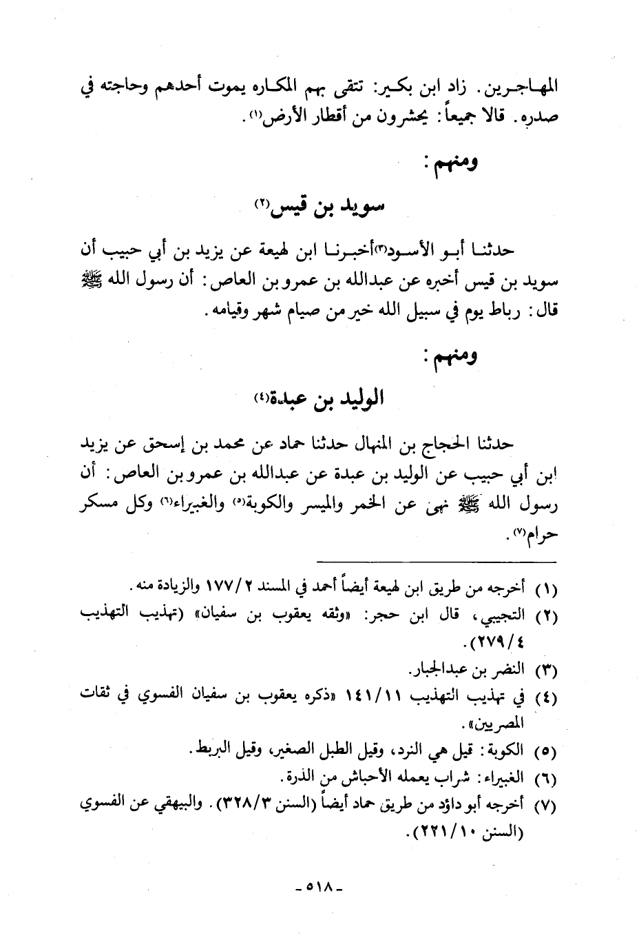 حَدَّثَنَا الْحَجَّاجُ بْنُ الْمِنْهَالِ حَدَّثَنَا حَمَّادٌ عن محمد بن إسحاق عن يزيد ابن أَبِي حَبِيبٍ عَنِ الْوَلِيدِ بْنِ عَبْدَةَ عَنْ عبد الله بن عمرو بن العاص: أن رَسُولَ اللَّهِ صَلَّى اللَّهُ عَلَيْهِ وَسَلَّمَ نَهَى عَنِ الْخَمْرِ وَالْمَيْسِرِ وَالْكُوبَةِ [5] وَالْغُبَيْرَاءِ [6] وَكُلِّ مُسْكِرٍ حرام [7] .