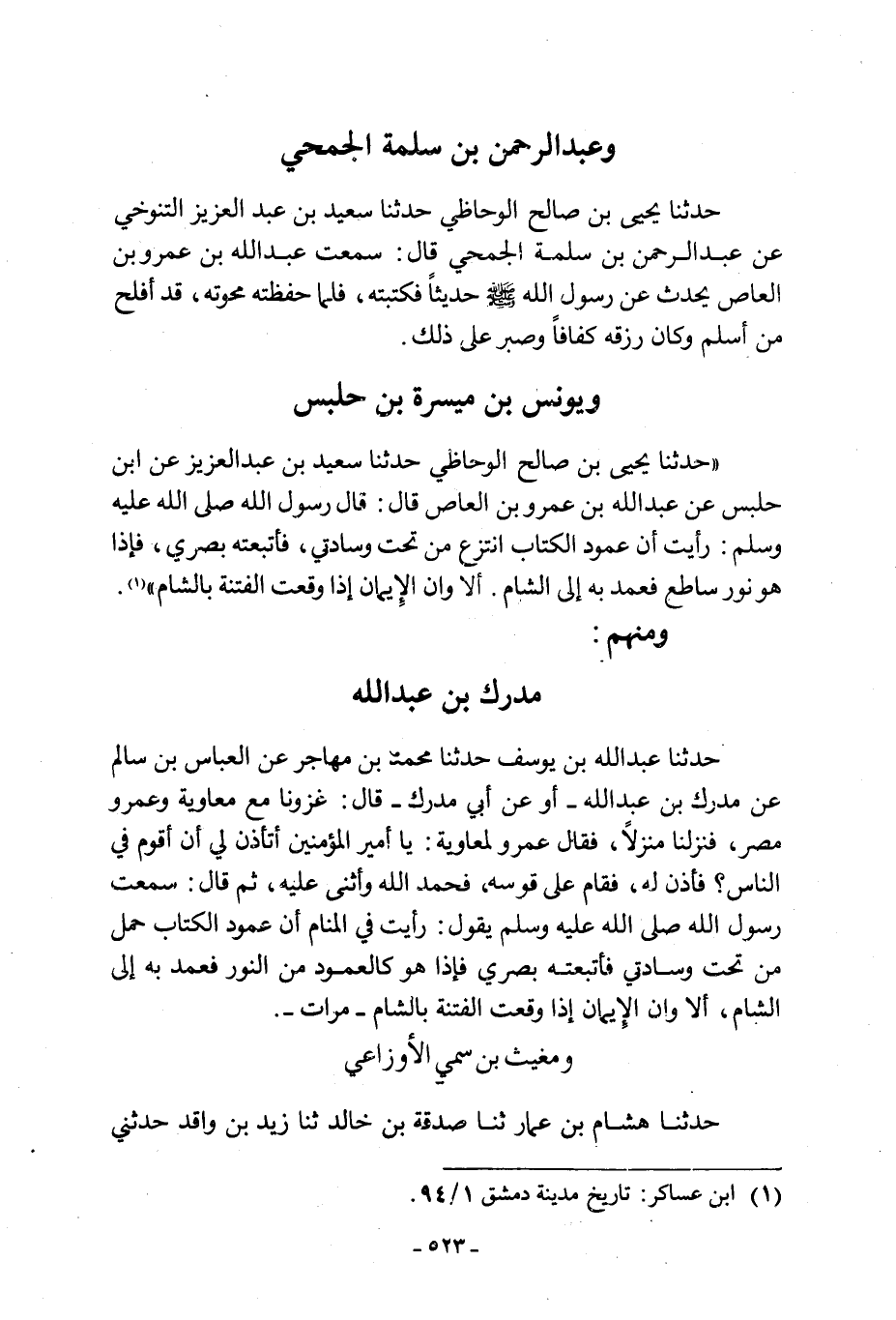 «حدثنا يحي بْنُ صَالِحٍ الْوُحَاظِيُّ حَدَّثَنَا سَعِيدُ بْنُ عَبْدِ الْعَزِيزِ عَنِ ابْنِ حَلْبَسٍ عَنْ عَبْدِ اللَّهِ بْنِ عَمْرِو بْنِ الْعَاصِ قَالَ: قَالَ رَسُولُ اللَّهِ صَلَّى اللَّهُ عَلَيْهِ وَسَلَّمَ: رَأَيْتُ أَنَّ عَمُودَ الْكِتَابِ انْتُزِعَ مِنْ تَحْتِ وِسَادَتِي، فَأَتْبَعْتُهُ بَصَرِي، فَإِذَا هُوَ نُورٌ سَاطِعٌ فَعُمِدَ بِهِ الى الشام. أن وَإِنَّ الْإِيمَانَ إِذَا وَقَعَتِ الْفِتْنَةُ بِالشَّامِ» [1] .
