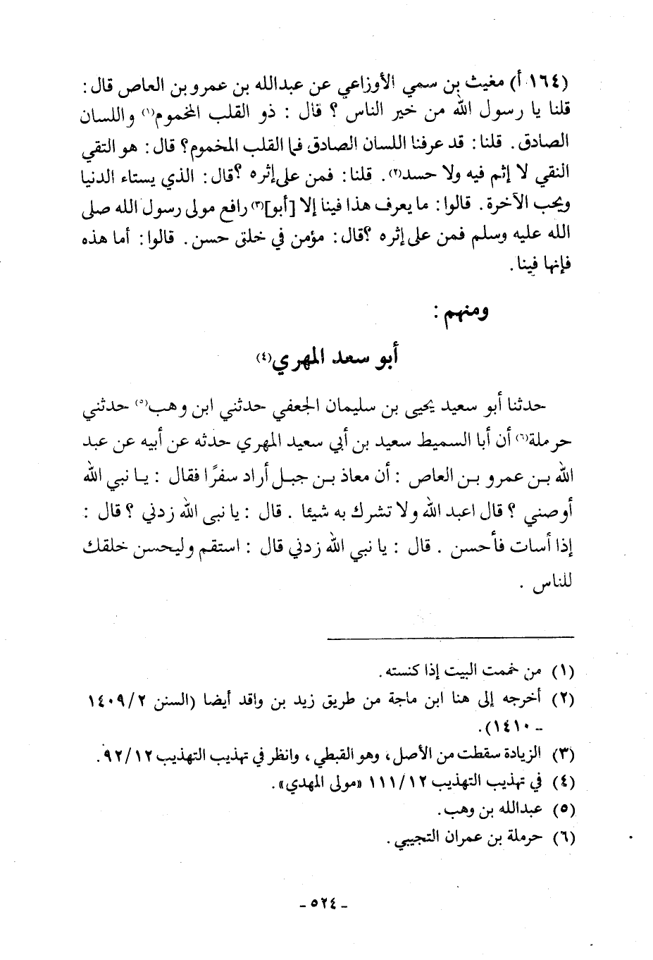 (164 أ) مُغِيثُ بْنُ سُمَيٍّ الْأَوْزَاعِيُّ عَنْ عَبْدِ اللَّهِ بْنِ عَمْرِو بْنِ الْعَاصِ قَالَ: قُلْتُ يَا رَسُولَ اللَّهِ مَنْ خَيْرُ النَّاسِ؟ قَالَ: ذُو الْقَلْبِ الْمَخْمُومِ [1] وَاللِّسَانِ الصَّادِقِ. قُلْنَا: قَدْ عَرَفْنَا اللِّسَانَ الصَّادِقَ فَمَا الْقَلْبُ الْمَخْمُومُ؟ قَالَ: هُوَ التَّقِيُّ النَّقِيُّ لَا إِثْمَ فِيهِ وَلَا حَسَدٌ [2] . قُلْنَا: فَمَنْ عَلَى أثْرِهِ؟ قَالَ: الَّذِي يَسْتَاءُ الدُّنْيَا وَيُحِبُّ الْآخِرَةَ. قَالُوا: مَا يَعْرِفُ هَذَا فِينَا إِلَّا [أَبُو] [3] رَافِعٍ مَوْلَى رَسُولِ اللَّهِ صَلَّى اللَّهُ عَلَيْهِ وَسَلَّمَ فَمَنْ عَلَى أثْرِهِ؟ قَالَ: مُؤْمِنٌ فِي خُلُقٍ حَسَنٍ. قَالُوا: أَمَّا هذه فأنها فينا.