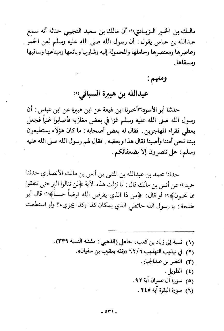 حَدَّثَنَا أَبُو الْأَسْوَدِ [3] أَخْبَرَنَا ابْنُ لَهِيعَةَ عَنِ ابْنِ هُبَيْرَةَ عَنِ ابْنِ عباس: أن رسول الله صلى الله عليه وَسَلَّمَ غَزَا فِي بَعْضِ مَغَازِيهِ فَأَصَابُوا غَنَمًا فجعل يعصي فُقَرَاءَ الْمُهَاجِرِينَ. فَقَالَ لَهُ بَعْضُ أَصْحَابِهِ: مَا كان هؤلاء يستطيعون بيننا نحن أَمَتْنَا وَأَصَبْنَا فَقَالَ هَذَا وَبَعْضَهُ. فَقَالَ لَهُمْ رسول الله صلى الله عليه وسلم: هل تُنْصَرُونَ إِلَّا بِضُعَفَائِكُمْ. حَدَّثَنَا مُحَمَّدُ بْنُ عَبْدِ اللَّهِ بْنِ الْمُثَنَّى بْنِ أَنَسِ بْنِ مَالِكٍ الْأَنْصَارِيُّ حَدَّثَنَا حُمَيْدٌ [4] عَنْ أَنَسِ بْنِ مَالِكٍ قَالَ: لَمَّا نَزَلَتْ هَذِهِ الْآيَةُ لَنْ تَنالُوا الْبِرَّ حَتَّى تُنْفِقُوا مِمَّا تُحِبُّونَ 3: 92 [5] أَوْ قَالَ: مَنْ ذَا الَّذِي يُقْرِضُ اللَّهَ قَرْضاً حَسَناً 2: 245 [6] قَالَ أَبُو طَلْحَةَ: يَا رَسُولَ اللَّهِ حَائِطِي الَّذِي بمَكَانَ كَذَا وَكَذا يُجْزِئُ؟ وَلَوِ اسْتَطَعْتُ أَنْ أُسِرَّهُ لَمْ أُعْلِنْهُ. قَالَ: اجْعَلْهُ فِي فقراء أهل