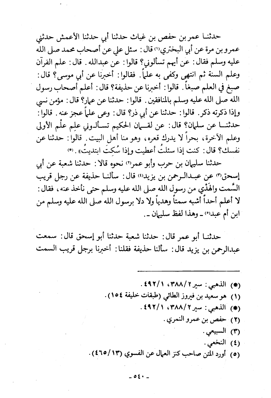 علم القرآن وَعَلِمَ السُّنَّةَ ثُمَّ انْتَهَى وَكَفَى بِهِ عِلْمًا. فقالوا: أَخْبَرَنَا عَنْ أَبِي مُوسَى؟ قَالَ: صُبِغَ فِي الْعِلْمِ صَبْغًا. قَالُوا: أَخْبَرْنَا عَنْ حُذَيْفَةَ؟ قَالَ: أَعْلَمُ أَصْحَابِ رَسُولِ اللَّهِ صَلَّى اللَّهُ عَلَيْهِ وَسَلَّمَ بِالْمُنَافِقِينَ. قَالُوا: حَدِّثْنَا عَنْ عَمَّارٍ؟