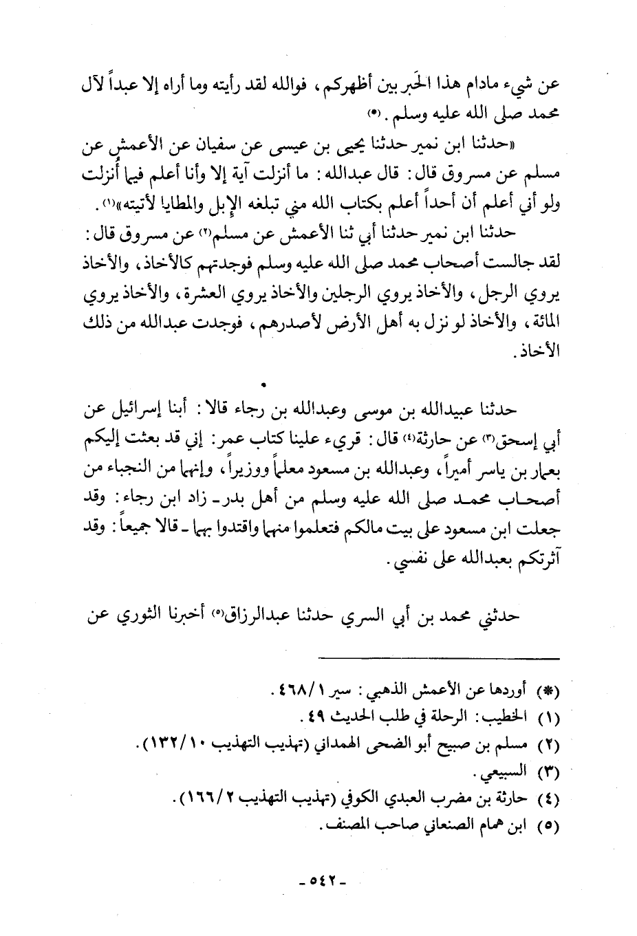 «حَدَّثَنَا ابْنُ نمير حدثنا يحي بْنُ عِيسَى عَنْ سُفْيَانَ عَنِ الْأَعْمَشِ عَنْ مُسْلِمٍ عَنْ مَسْرُوقٍ قَالَ: قَالَ عَبْدُ اللَّهِ: مَا أُنْزِلَتْ آيَةٌ إِلَّا وَأَنَا أَعْلَمُ فِيمَا أُنْزِلَتْ وَلَوْ أَنِّي أَعْلَمُ أَنَّ أَحَدًا أَعْلَمُ بِكِتَابِ اللَّهِ مِنِّي تَبْلُغُهُ الْإِبِلُ وَالْمَطَايَا لَأَتَيْتُهُ» [1] .