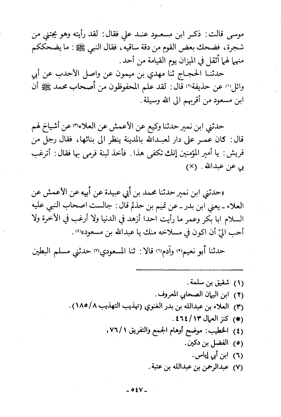 «حَدَّثَنِي ابْنُ نُمَيْرٍ حَدَّثَنَا محمد بن أَبِي عُبَيْدَةَ عَنْ أَبِيهِ عَنِ الْأَعْمَشِ عَنْ الْعَلَاءِ- يَعْنِي ابْنَ بَدْرٍ- عَنْ تَمِيمِ بْنِ حذلم قال: جالست أصحاب النبي عليه السلام أَبَا بَكْرٍ وَعُمَرَ مَا رَأَيْتُ أَحَدًا أَزْهَدَ في الدنيا ولا أرعب فِي الْآخِرَةِ وَلَا أَحَبَّ إِلَيَّ أَنْ أَكُونَ فِي مِسْلَاخِهِ مِنْكَ يَا عَبْدَ اللَّهِ بْنَ مَسْعُودٍ» [4] .
