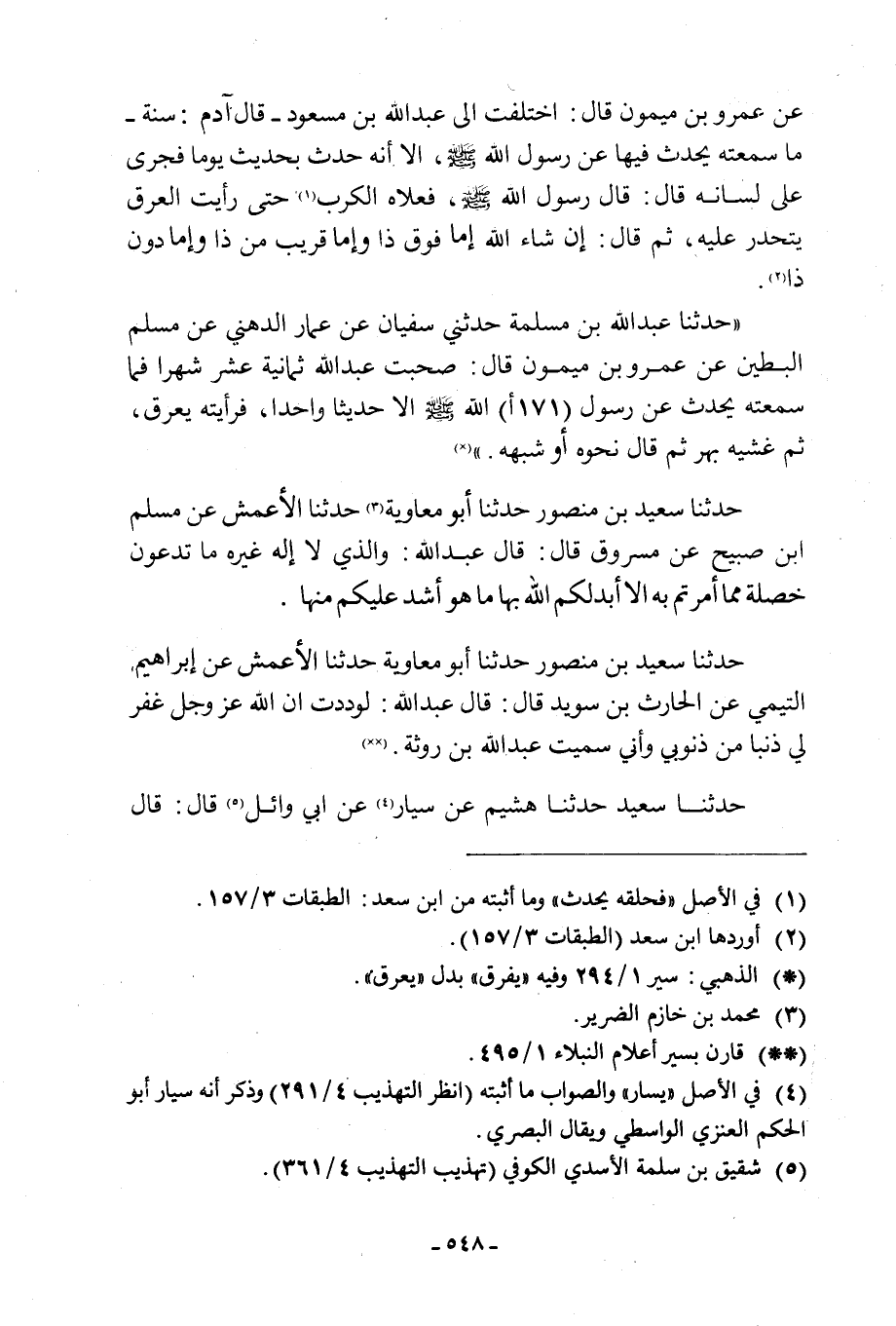 إِنْ شَاءَ اللَّهُ إِمَّا فَوْقَ ذَا وَإِمَّا قَرِيبٌ مِنْ ذَا وَإِمَّا دُونَ ذَا [2] . حَدَّثَنَا عَبْدُ اللَّهِ بْنُ مَسْلَمَةَ حَدَّثَنِي سُفْيَانُ عَنْ عَمَّارٍ الدُّهْنِيِّ عَنْ مُسْلِمٍ الْبَطِينِ عَنْ عَمْرِو بْنِ مَيْمُونٍ قَالَ: صَحِبْتُ عَبْدَ اللَّهِ ثَمَانِيَةَ عَشْرَ شَهْرًا فَمَا سَمِعْتُهُ يحدث عن رسول (171 أ) اللَّهِ صَلَّى اللَّهُ عَلَيْهِ وَسَلَّمَ إِلَّا حَدِيثًا وَاحِدًا، فَرَأَيْتُهُ يَعْرَقُ، ثُمَّ غَشِيَهُ بُهْرٌ ثُمَّ قَالَ نَحْوَهُ أَوْ شِبْهَهُ.