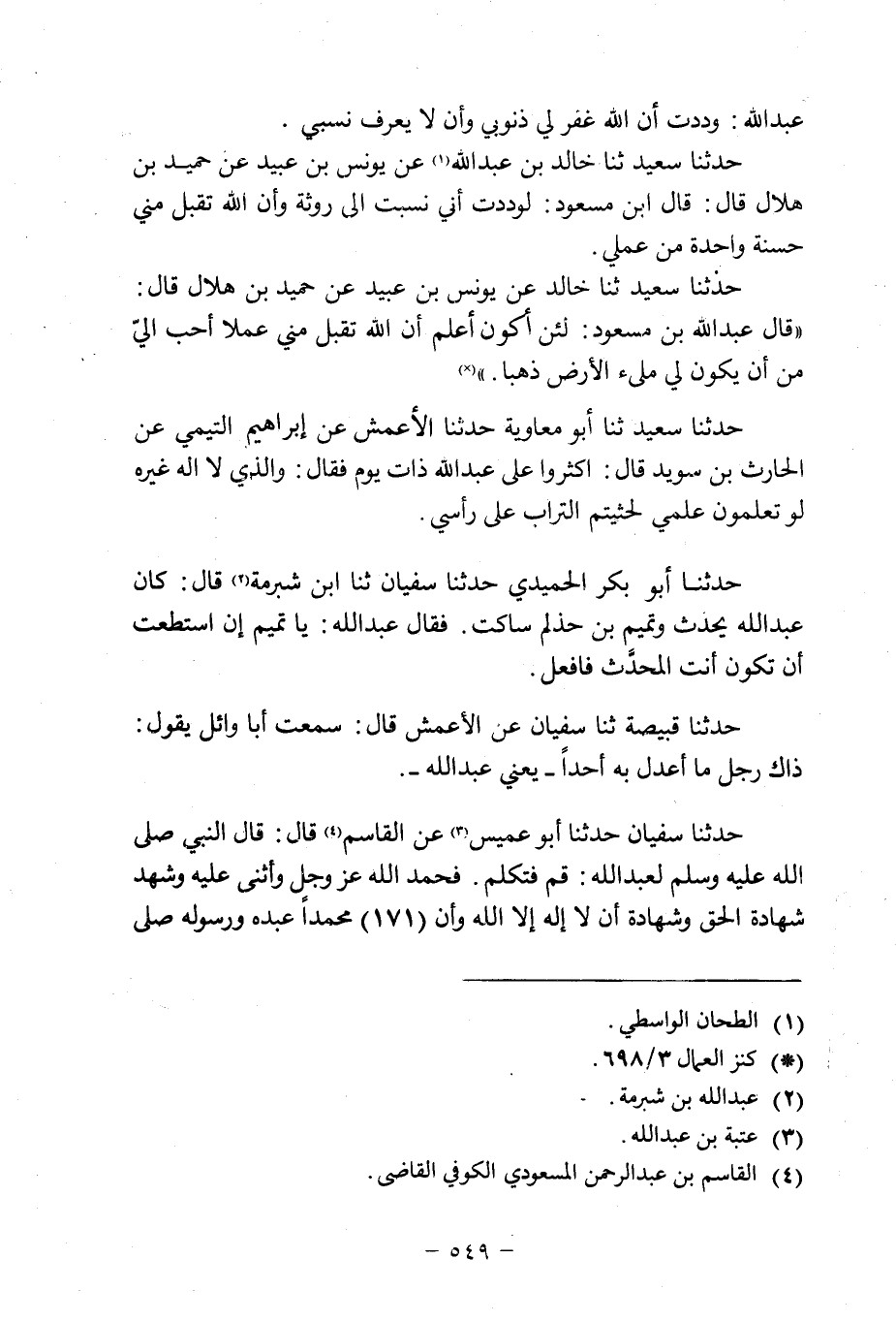 حَدَّثَنَا سَعِيدٌ ثَنَا خَالِدُ بْنُ عَبْدِ اللَّهِ [1] عَنْ يُونُسَ بن عبيد عن حميد ابن هِلَالٍ قَالَ: قَالَ ابْنُ مَسْعُودٍ: لَوَدِدْتُ أَنِّي نُسِبْتُ إِلَى رَوْثَةٍ وَأَنَّ اللَّهَ تَقَبَّلَ مِنِّي حَسَنَةً وَاحِدَةً مِنْ عَمَلِي.