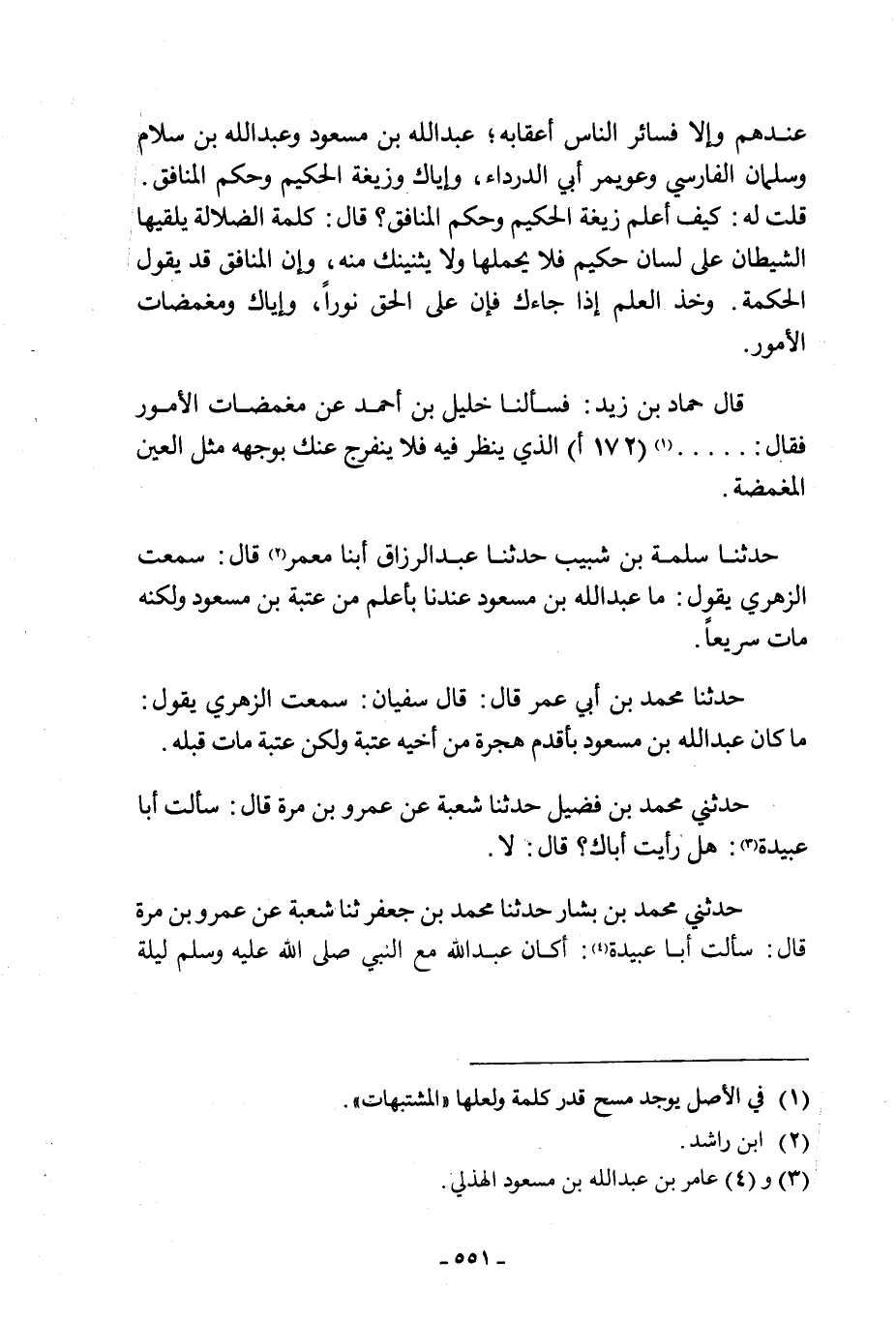 حَدَّثَنَا سَلَمَةُ بْنُ شَبِيبٍ حَدَّثَنَا عَبْدُ الرَّزَّاقِ أَنْبَأَ مَعْمَرٌ [3] قَالَ: سَمِعْتُ الزُّهْرِيَّ يَقُولُ: مَا عَبْدُ اللَّهِ بْنُ مَسْعُودٍ عِنْدَنَا بِأَعْلَمَ مِنْ عُتْبَةَ بْنِ مَسْعُودٍ وَلَكِنَّهُ مَاتَ سَرِيعًا.