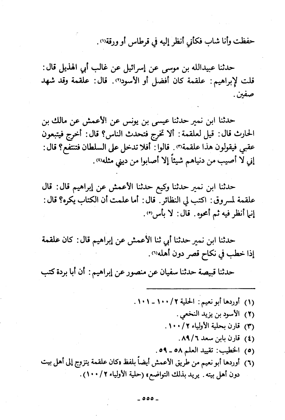 حَدَّثَنَا ابْنُ نُمَيْرٍ حَدَّثَنَا عِيسَى بْنُ يُونُسَ عَنِ الْأَعْمَشِ عَنْ مَالِكِ بْنِ الْحَارِثِ قَالَ: قِيلَ لِعَلَقْمَةَ: أَلَا تَخْرُجُ فَتُحَدِّثَ النَّاسَ؟ قَالَ: أَخْرُجُ فَيَتَّبِعُونَ عَقِبِي فَيَقُولُونَ هَذَا عَلْقَمَةُ [3] . قَالُوا: أَفَلَا تَدْخُلُ عَلَى السُّلْطَانِ فَتَنْتَفِعَ؟ قَالَ: إِنِّي لَا أُصِيبُ مِنْ دُنْيَاهُمْ شَيْئًا إِلَّا أَصَابُوا مِنْ دِينِي مِثْلَهُ [4] .