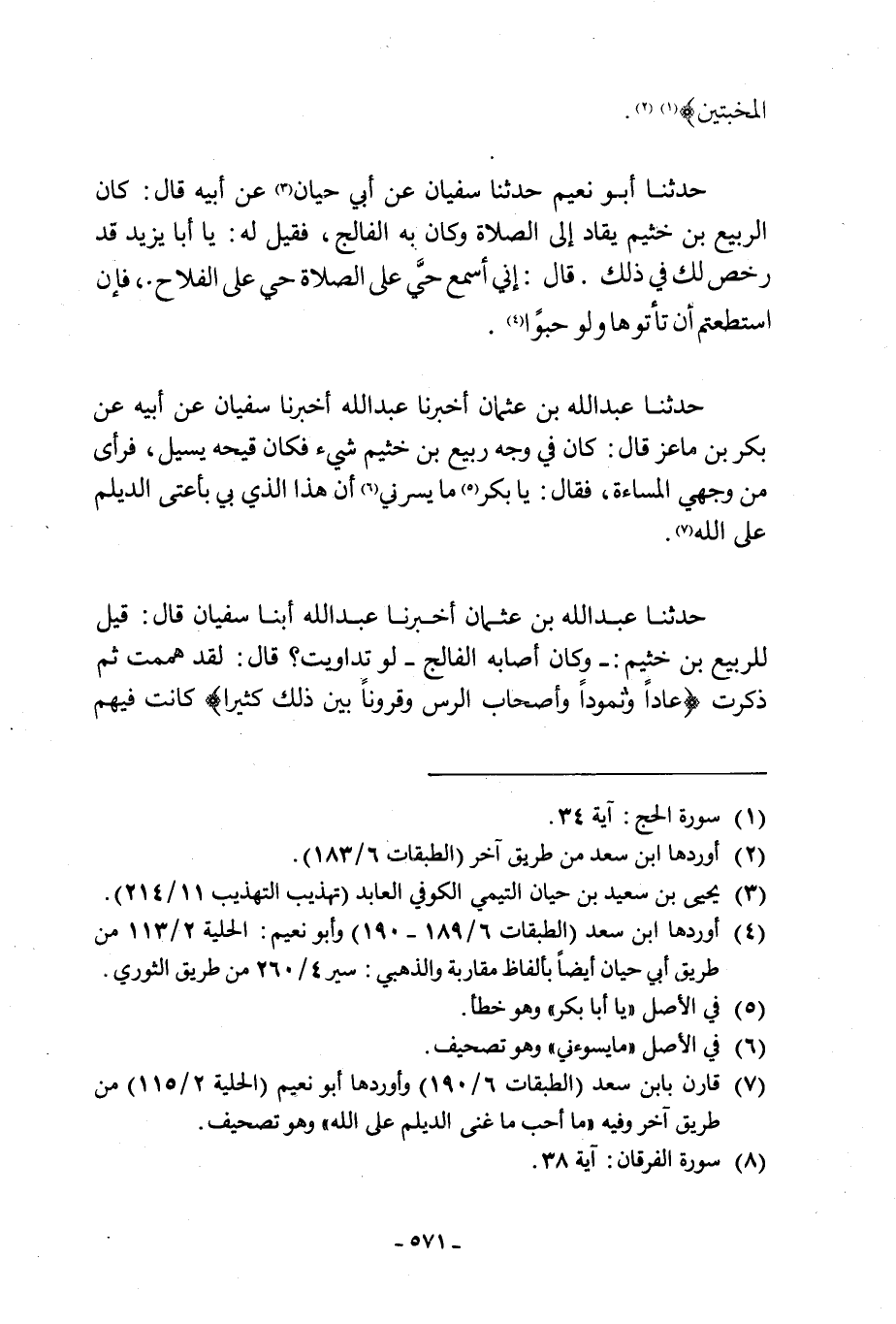 حَدَّثَنَا أَبُو نُعَيْمٍ حَدَّثَنَا سُفْيَانُ عَنْ أَبِي حَيَّانَ [3] عَنْ أَبِيهِ قَالَ: كَانَ الرَّبِيعُ بْنُ خُثَيْمٍ يُقَادُ إِلَى الصَّلَاةِ وَكَانَ بِهِ الْفَالِجُ، فَقِيلَ لَهُ: يَا أَبَا يَزِيدَ قَدْ رُخِّصَ لَكَ فِي ذَلِكَ. قَالَ إِنِّي أَسْمَعُ حَيَّ عَلَى الْفَلَاحِ، فَإِنِ اسْتَطَعْتُمْ أَنْ تَأْتُوهَا وَلَوْ حَبْوًا [4] .