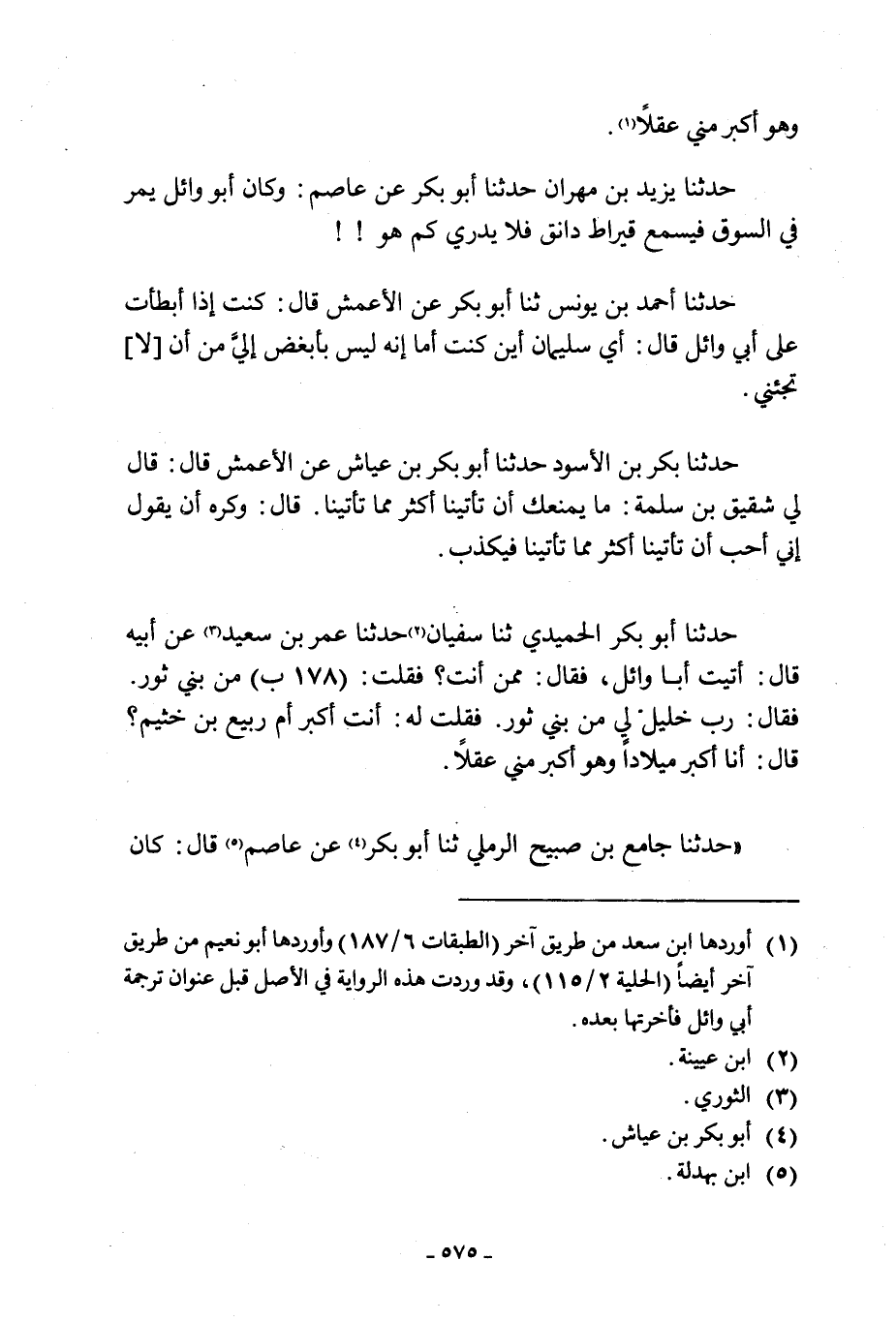 [1] أوردها ابن سعد من طريق آخر (الطبقات 6/ 187) وأوردها ابو نعيم من طريق آخر أيضا (الحلية 2/ 115) ، وقد وردت هذه الرواية في الأصل قبل عنوان ترجمة أبي وائل فأخرتها بعده.
