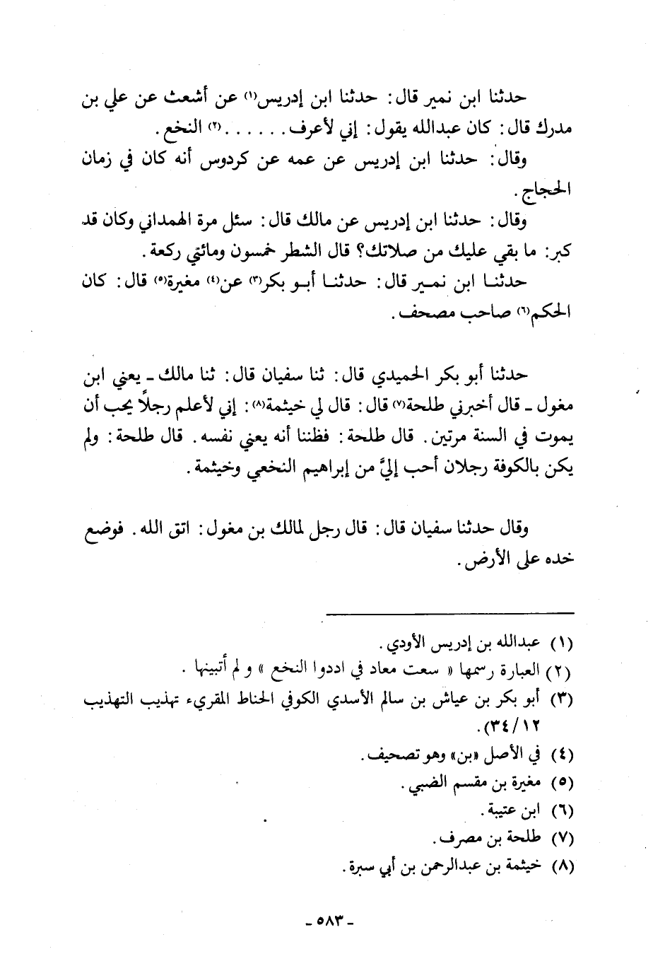 حَدَّثَنَا أَبُو بَكْرٍ الْحُمَيْدِيُّ قَالَ: ثَنَا سُفْيَانُ قَالَ: ثَنَا مَالِكٌ- يَعْنِي ابْنَ مِغْوَلٍ- قَالَ أَخْبَرَنِي طَلْحَةُ [7] قَالَ: قَالَ لِي خَيْثَمَةُ [8] : اني لا علم رجلا يجب أَنْ يَمُوتَ فِي السَّنَةِ مَرَّتَيْنِ. قَالَ طَلْحَةُ: فظننا انه يعني نفسه. قال طلحة: ولم يَكُنْ بِالْكُوفَةِ رَجُلَانِ أَحَبَّ إِليَّ مِنْ إِبْرَاهِيمَ النَّخَعِيِّ وَخَيْثَمَةَ.