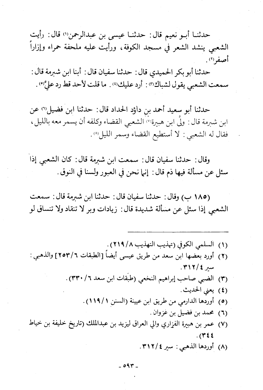 (185 ب) وَقَالَ: حَدَّثَنَا سُفْيَانُ قَالَ: حَدَّثَنَا ابْنُ شُبْرُمَةَ قَالَ: سَمِعْتُ الشَّعْبِيَّ إِذَا سُئِلَ عَنْ مَسْأَلَةٍ شَدِيدَةٍ قَالَ: زِيَادَاتُ وَبَرٍ لَا تَنْقَادُ وَلَا تنساق