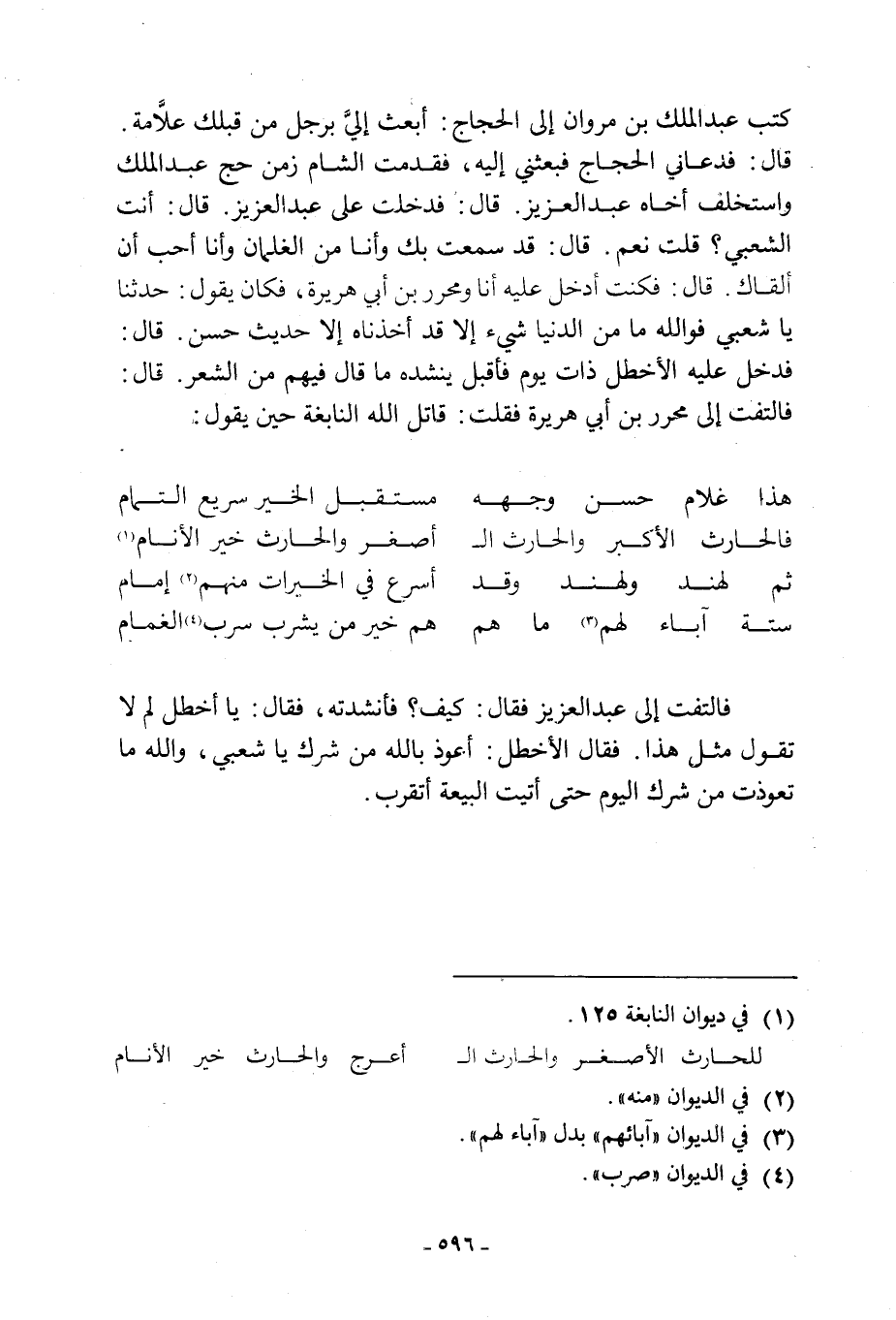 أَنْتَ الشَّعْبِيُّ؟ قُلْتُ نَعَمْ. قَالَ: قَدْ سَمِعْتُ بِكَ وَأَنَا مِنَ الْغِلْمَانِ وَأَنَا أُحِبُّ أَنْ ألقاك. قال: فكنت أَدْخُلُ عَلَيْهِ أَنَا وَمُحَرَّرُ بْنُ أَبِي هُرَيْرَةَ، فكان يقول: حدثنا يا شعبي فو الله مَا مِنَ الدُّنْيَا شَيْءٌ إِلَّا قَدْ أَخَذْنَاهُ إِلَّا حَدِيثٌ حَسَنٌ. قَالَ: فَدَخَلَ عَلَيْهِ الْأَخْطَلُ ذَاتَ يَوْمٍ فَأَقْبَلَ يُنْشِدُهُ مَا قَالَ فِيهِمْ من الشعر. قال: فالتفت إِلَى مُحَرَّرِ بْنِ أَبِي هُرَيْرَةَ فَقُلْتُ: قَاتَلَ اللَّهُ النَّابِغَةَ حِينَ يَقُولُ: