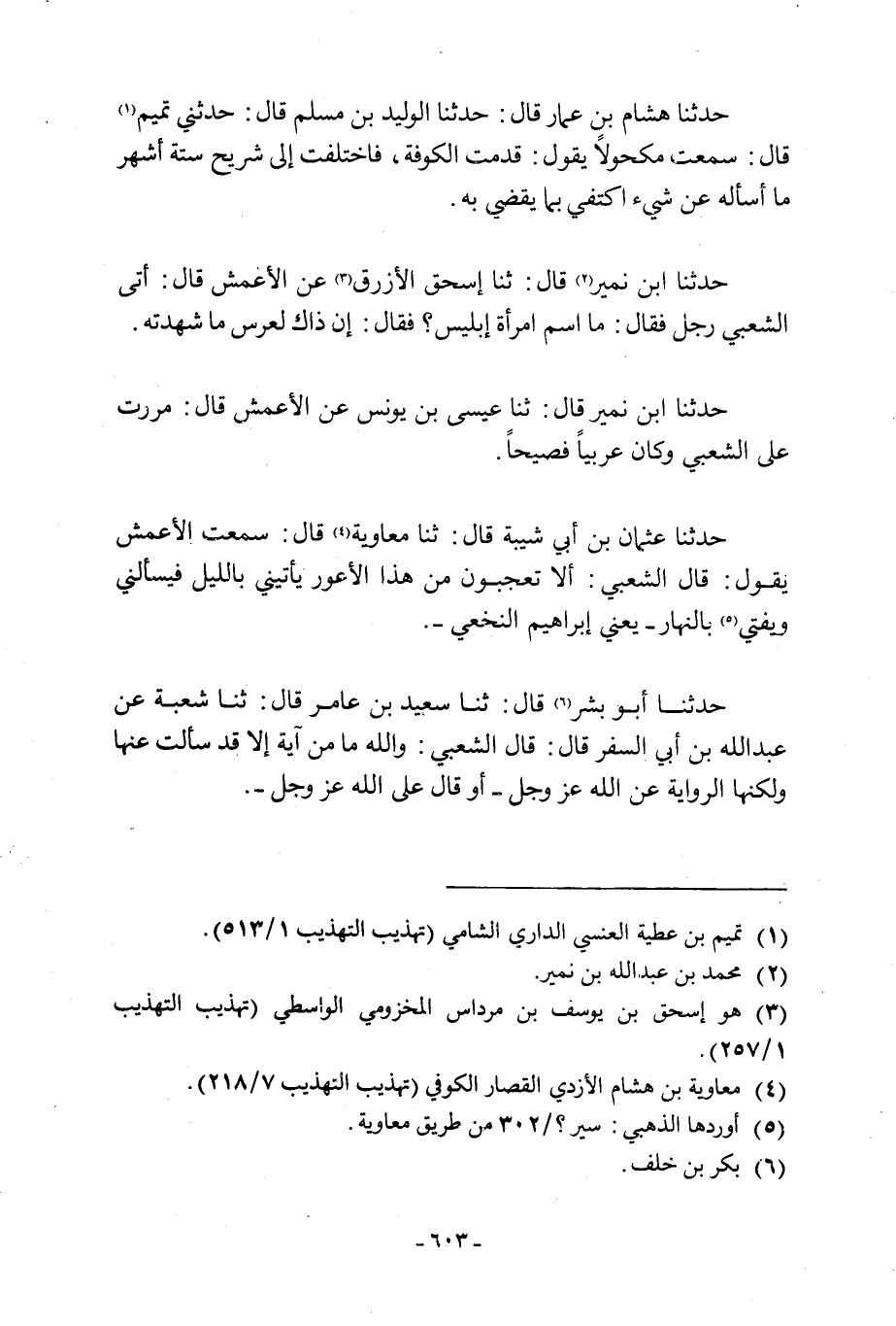حَدَّثَنَا عُثْمَانُ بْنُ أَبِي شَيْبَةَ قَالَ: ثَنَا مُعَاوِيَةُ [4] قَالَ: سَمِعْتُ الْأَعَمْشَ يَقُولُ: قَالَ الشَّعْبِيُّ: أَلَا تَعْجَبُونَ مِنْ هَذَا الْأَعْوَرِ يَأْتِينِي بِاللَّيْلِ فَيَسْأَلُنِي وَحَتَّى [5] بِالنَّهَارِ- يَعْنِي إِبْرَاهِيمَ النَّخَعِيَّ-.