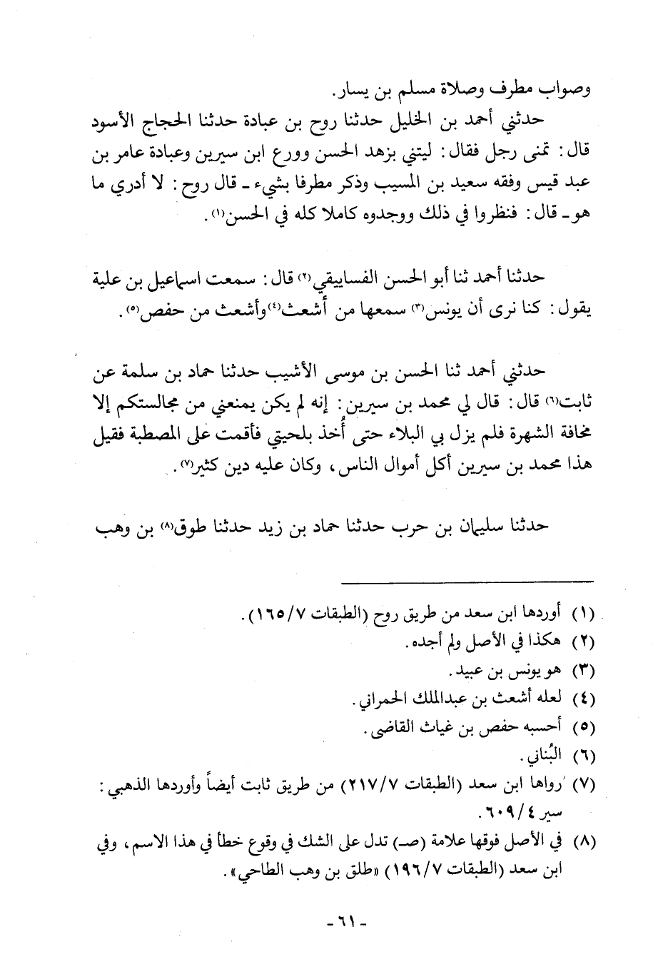 حَدَّثَنِي أَحْمَدُ بْنُ الْخَلِيلِ حَدَّثَنَا رَوْحُ بْنُ عُبَادَةَ حَدَّثَنَا الْحَجَّاجُ الْأَسْوَدُ قَالَ: تَمَنَّى رَجُلٌ فَقَالَ: لَيْتَنِي بِزُهْدِ الْحَسَنِ وَوَرَعِ ابْنِ سِيرِينَ وَعِبَادَةِ عَامِرِ بْنِ عَبْدِ قَيْسٍ وَفِقْهِ سَعِيدِ بْنِ الْمُسَيِّبِ وَذَكَرَ مُطَرِّفًا بِشَيْءٍ- قَالَ رَوْحٌ: لَا أَدْرِي مَا هُوَ- قَالَ: فَنَظَرُوا فِي ذَلِكَ وَوَجَدُوهُ كَامِلًا كُلَّهُ فِي الْحَسَنِ [1] .