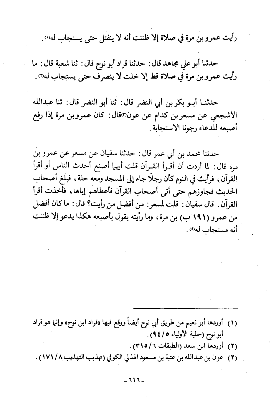 حَدَّثَنَا أَبُو عَلِيٍّ مُجَاهِدٌ قَالَ: حَدَّثَنَا قراد أبو نوح قال: ثنا شعبة قال: ما رَأَيْتُ عَمْرَو بْنَ مُرَّةَ فِي صَلَاةٍ قَطُّ إِلَّا خِلْتُ لَا يَنْصَرِفُ حَتَّى يُسْتَجَابَ لَهُ [2] .