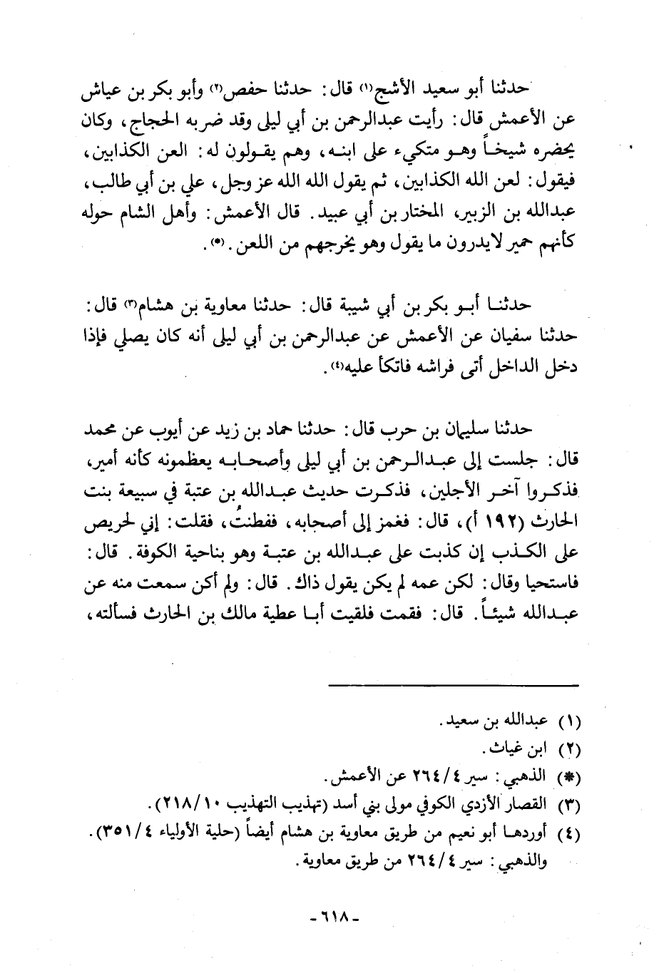 حَدَّثَنَا أَبُو سَعِيدٍ الْأَشَجُّ [1] قَالَ: حَدَّثَنَا حَفْصٌ [2] وَأَبُو بَكْرِ بْنُ عَيَّاشٍ عَنِ الْأَعْمَشِ قَالَ: رَأَيْتُ عَبْدَ الرَّحْمَنِ بْنَ أَبِي لَيْلَى وَقَدْ ضَرَبَهُ الْحَجَّاجُ وَكَانَ يَحْضُرُهُ شَيْخًا وَهُوَ مُتَّكِئٌ عَلَى ابْنِهِ وَهُمْ يَقُولُونَ لَهُ الْعَنِ الْكَذَّابِينَ، فَيَقُولُ لَعَنَ اللَّهُ الْكَذَّابِينَ، ثُمَّ يَقُولُ اللَّهُ اللَّهُ عَزَّ وَجَلَّ، عَلِيُّ بْنُ أَبِي طَالِبٍ، عبد الله ابن الزُّبَيْرِ، الْمُخْتَارُ بْنُ أَبِي عُبَيْدٍ. قَالَ الْأَعْمَشُ: وَأَهْلُ الشَّامِ حَوْلَهُ كَأَنَّهُمْ حَمِيرٌ لَا يَدْرُونَ مَا يَقُولُ وَهُوَ يُخْرِجُهُمْ مِنَ اللَّعْنِ.