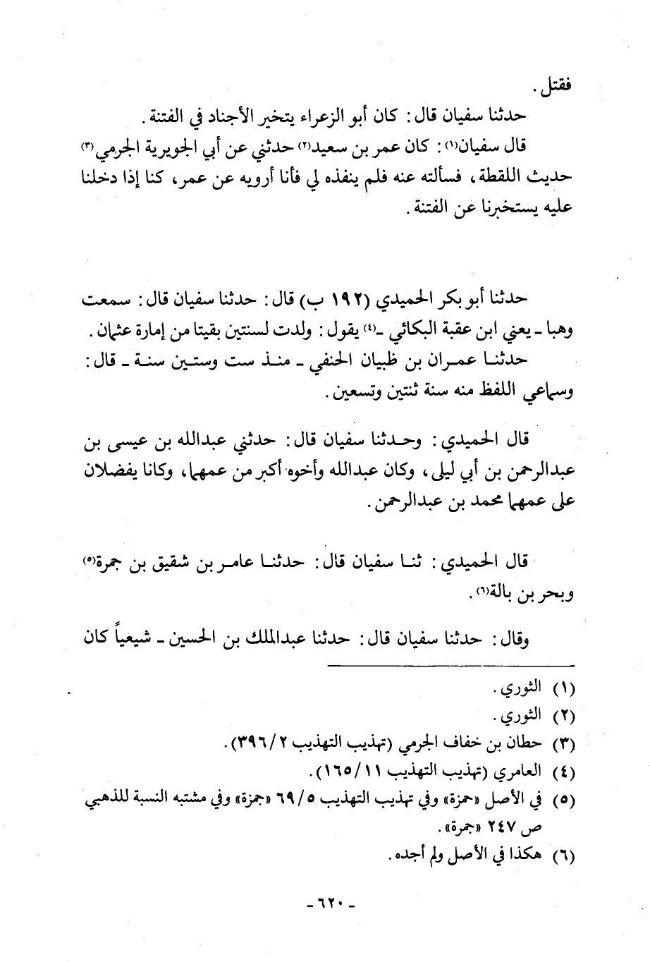 قَالَ الْحُمَيْدِيُّ: ثنا سُفْيَانُ قَالَ: حَدَّثَنَا عَامِرُ بْنُ شَقِيقِ بْنِ جَمْرَةَ [5] وَبَحْرُ بْنُ بَالِهٍ [6] .